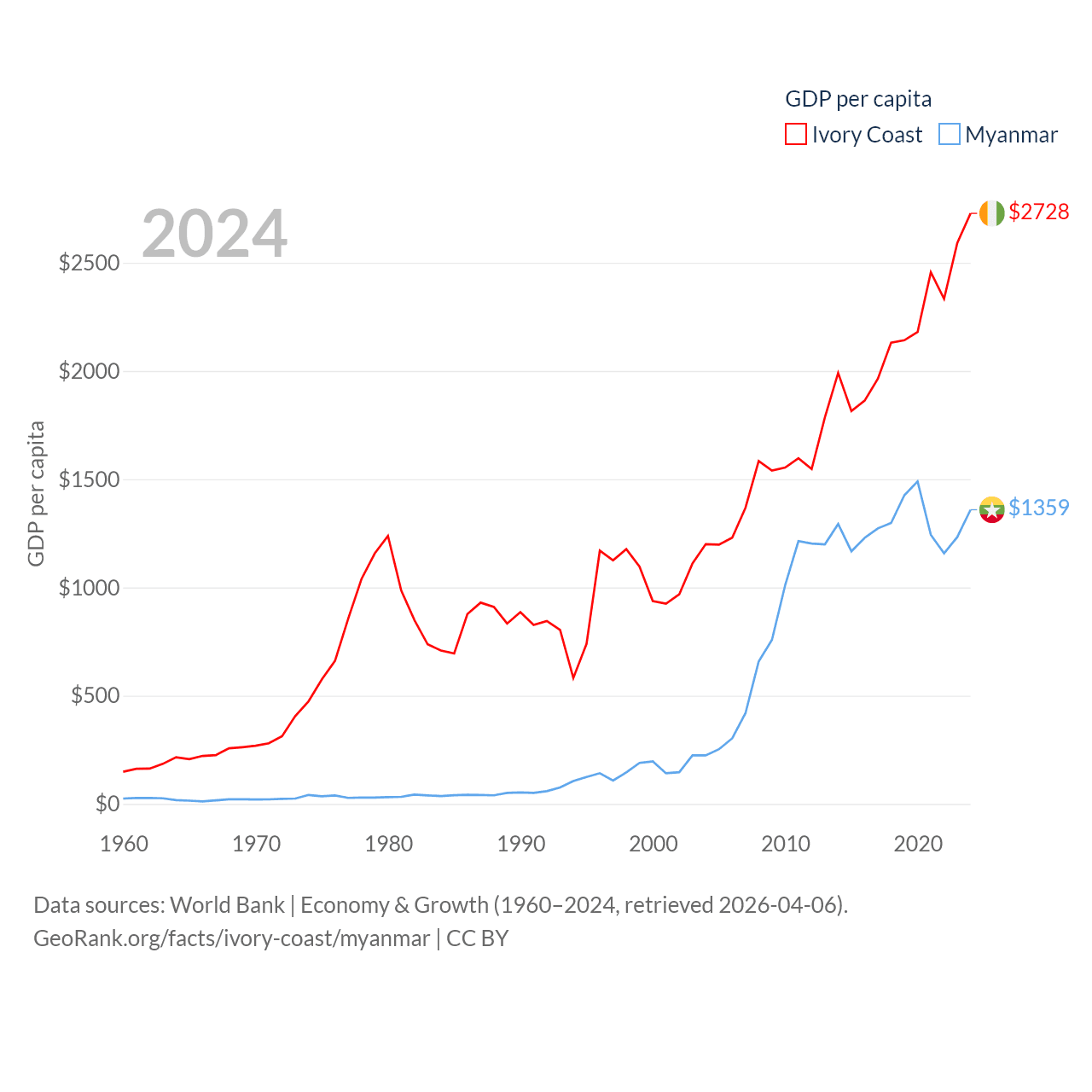By GDP, Ivory Coast ranks 77/197 ($87.1B) and Myanmar ranks 85/197 ($74.1B). By GDP per capita, Ivory Coast ranks 142/197 ($2,728), while Myanmar ranks 165/197 ($1,359).