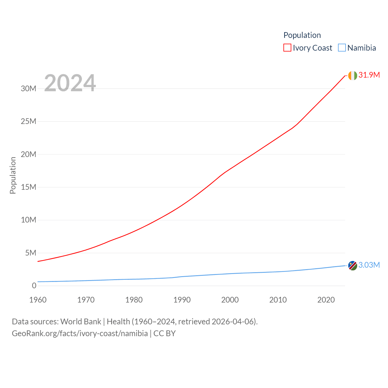 Ivory Coast has a population of 31.9M (ranked 50/197), compared with 3.03M in Namibia (ranked 136/197). Ivory Coast's land area is 122,780 sq mi versus 317,874 sq mi for Namibia (ranked 66th vs. 33rd).