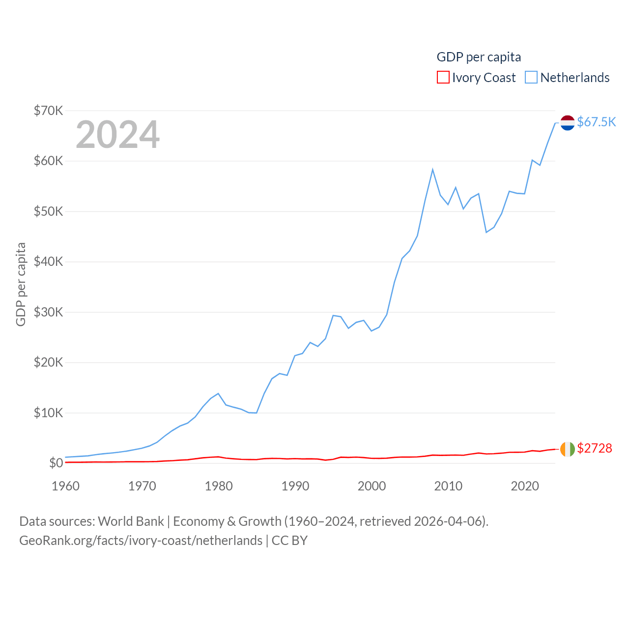 By GDP, Ivory Coast ranks 77/197 ($87.1B) and The Netherlands ranks 19/197 ($1.21T). By GDP per capita, Ivory Coast ranks 142/197 ($2,728), while The Netherlands ranks 13/197 ($67,520).