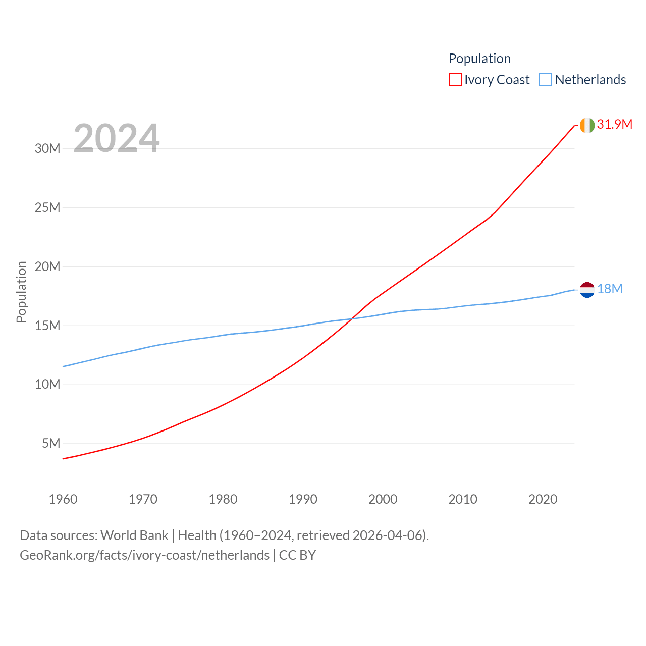 Ivory Coast has a population of 31.9M (ranked 50/197), compared with 18M in The Netherlands (ranked 72/197). Ivory Coast's land area is 122,780 sq mi versus 13,000 sq mi for The Netherlands (ranked 66th vs. 134th).