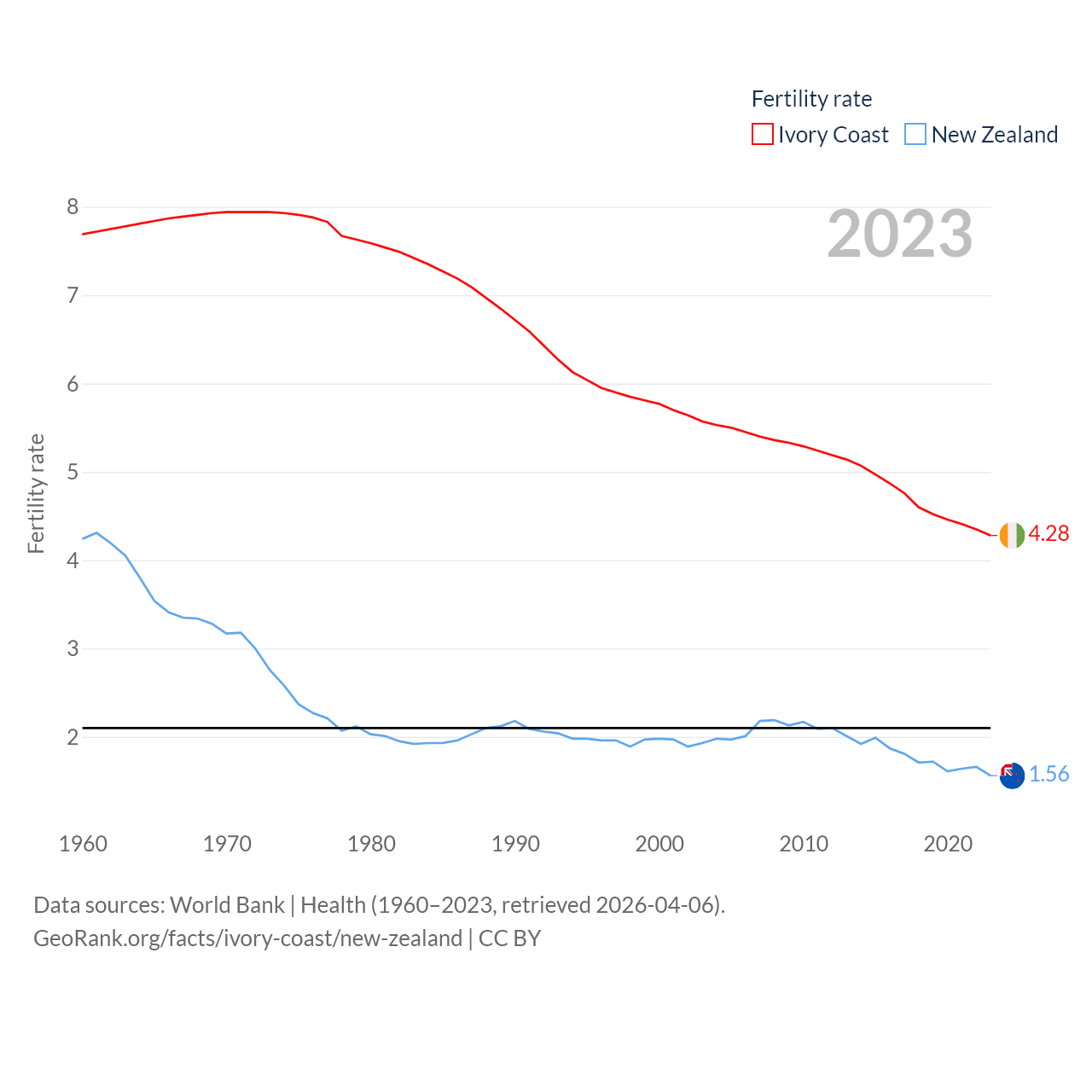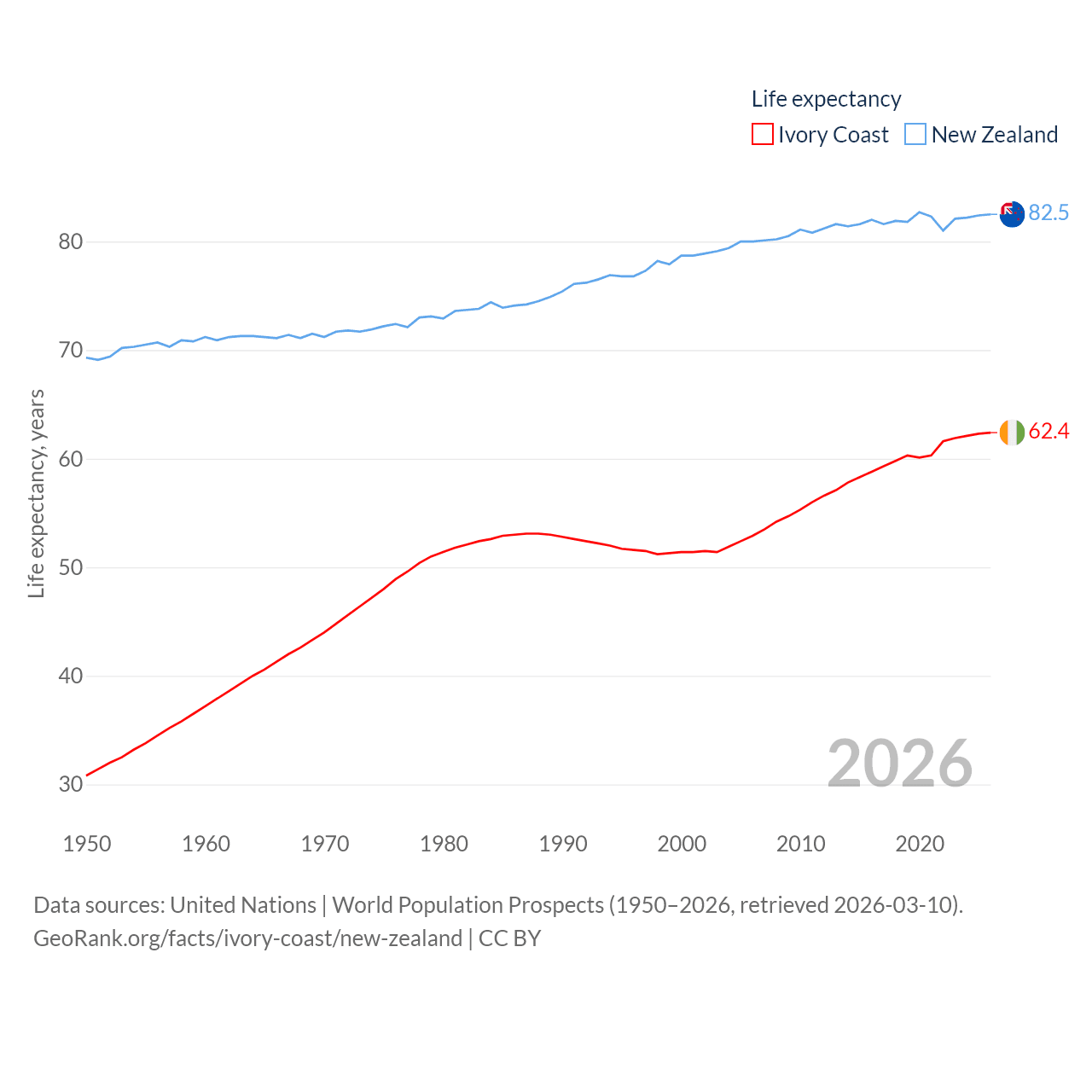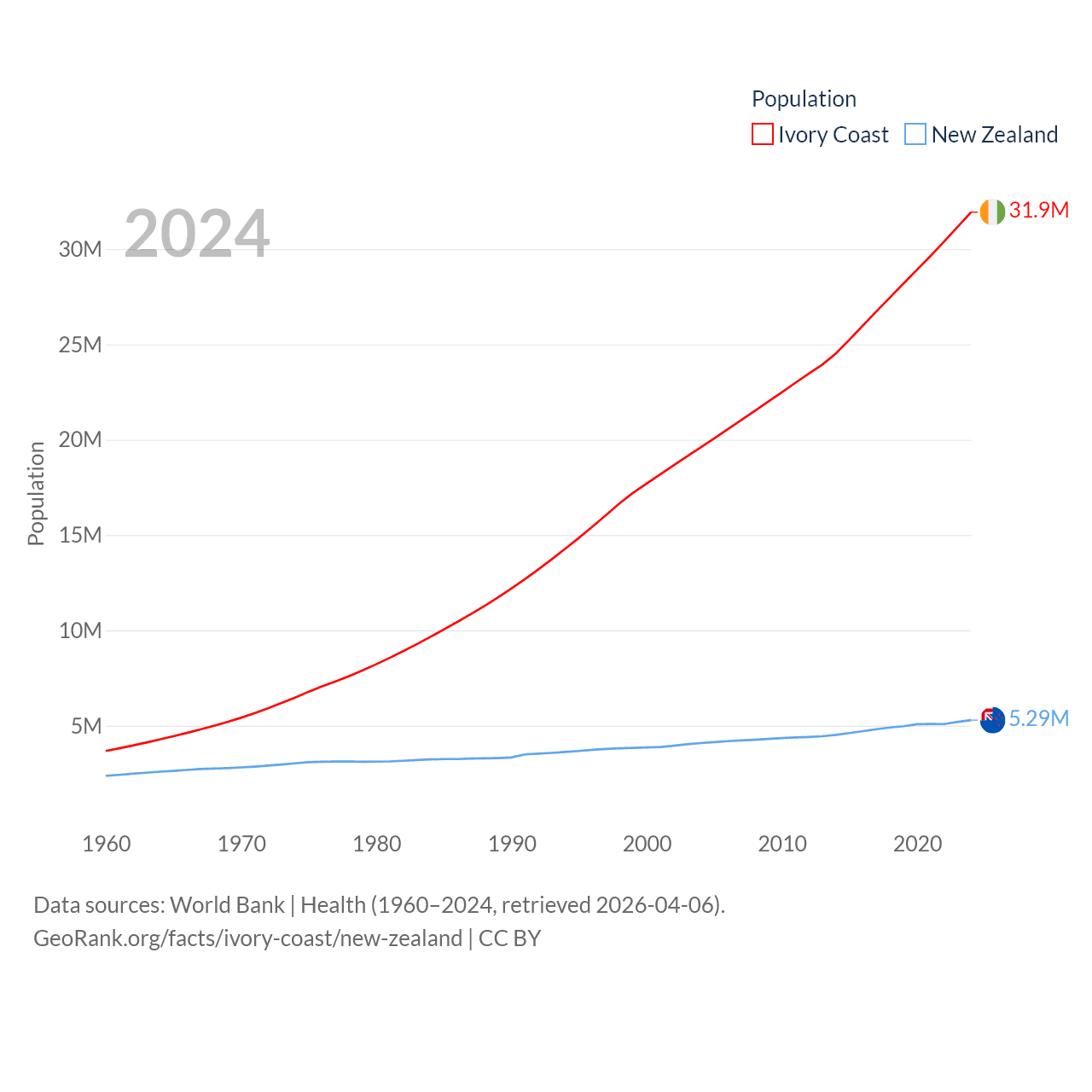 Ivory Coast has a population of 31.9M (ranked 50/197), compared with 5.29M in New Zealand (ranked 123/197). Ivory Coast's land area is 122,780 sq mi versus 101,665 sq mi for New Zealand (ranked 66th vs. 74th).