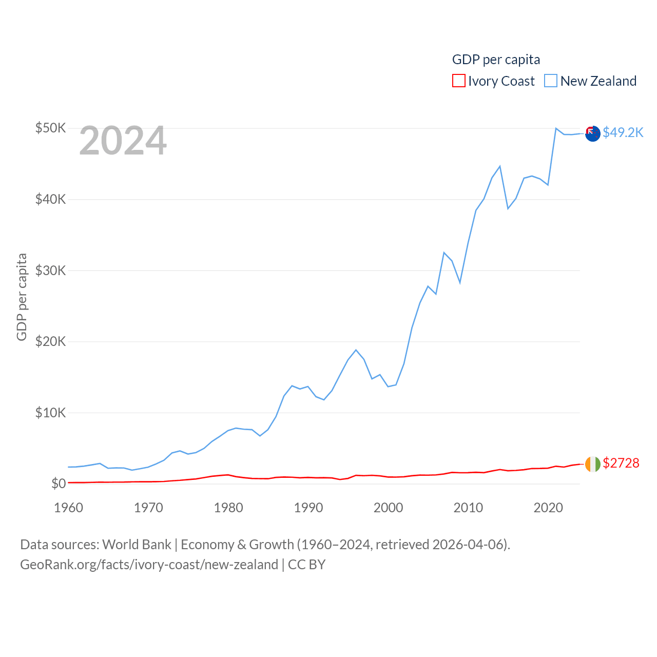 By GDP, Ivory Coast ranks 77/197 ($87.1B) and New Zealand ranks 52/197 ($260B). By GDP per capita, Ivory Coast ranks 142/197 ($2,728), while New Zealand ranks 26/197 ($49,205).