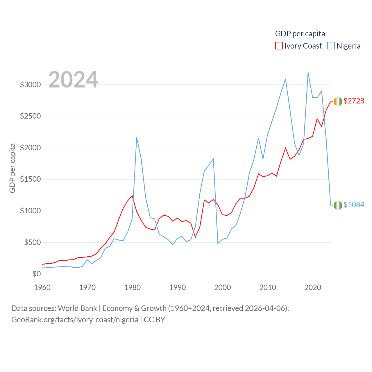 By GDP, Ivory Coast ranks 77/197 ($87.1B) and Nigeria ranks 54/197 ($252B). By GDP per capita, Ivory Coast ranks 142/197 ($2,728), while Nigeria ranks 174/197 ($1,084).