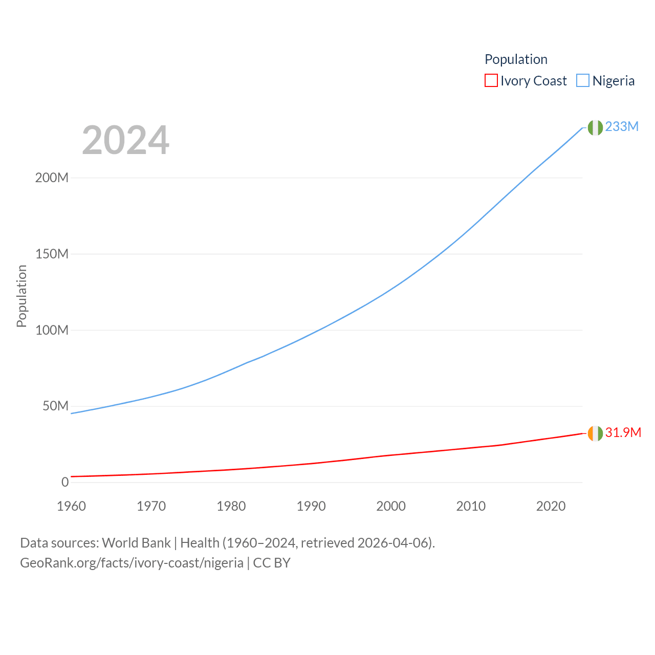Ivory Coast has a population of 31.9M (ranked 50/197), compared with 233M in Nigeria (ranked 6/197). Ivory Coast's land area is 122,780 sq mi versus 351,650 sq mi for Nigeria (ranked 66th vs. 30th).