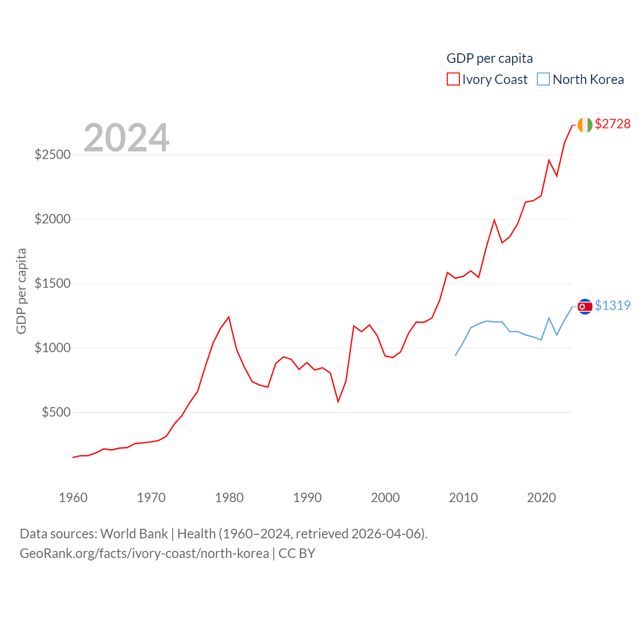 By GDP, Ivory Coast ranks 77/197 ($87.1B) and North Korea ranks 106/197 ($34.9B). By GDP per capita, Ivory Coast ranks 142/197 ($2,728), while North Korea ranks 168/197 ($1,319).