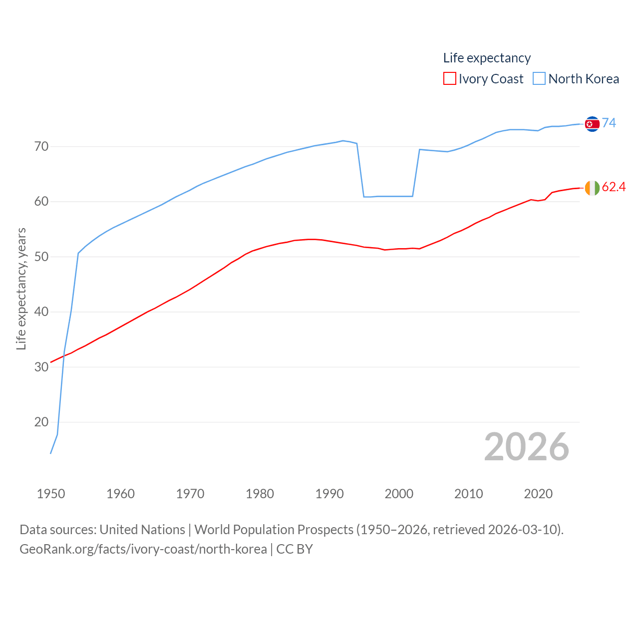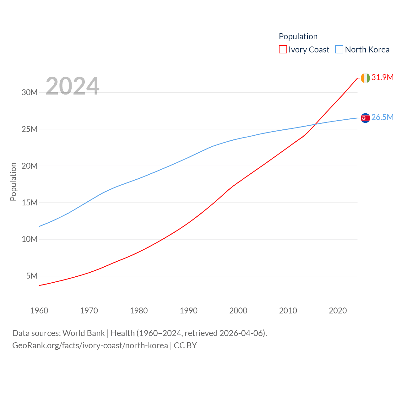 Ivory Coast has a population of 31.9M (ranked 50/197), compared with 26.5M in North Korea (ranked 56/197). Ivory Coast's land area is 122,780 sq mi versus 46,491 sq mi for North Korea (ranked 66th vs. 97th).