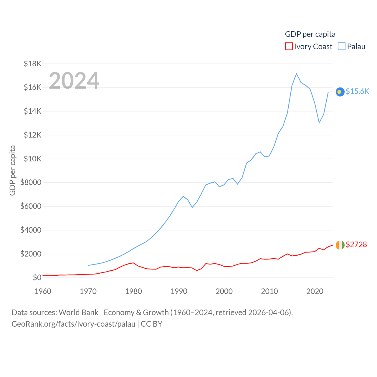 By GDP, Ivory Coast ranks 77/197 ($87.1B) and Palau ranks 194/197 ($277M). By GDP per capita, Ivory Coast ranks 142/197 ($2,728), while Palau ranks 67/197 ($15,611).