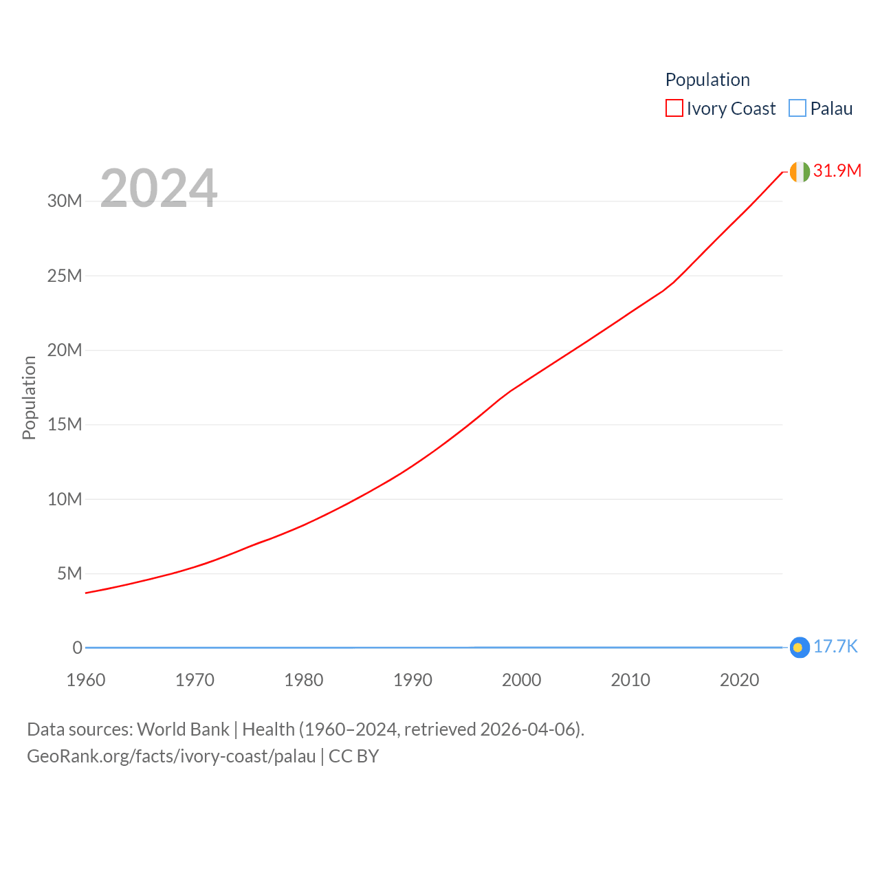 Ivory Coast has a population of 31.9M (ranked 50/197), compared with 17.7K in Palau (ranked 194/197). Ivory Coast's land area is 122,780 sq mi versus 177.6 sq mi for Palau (ranked 66th vs. 180th).