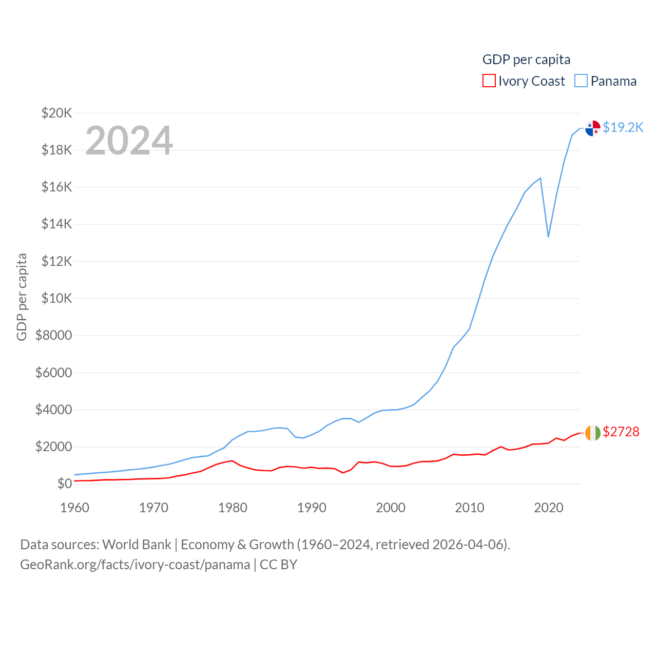 By GDP, Ivory Coast ranks 77/197 ($87.1B) and Panama ranks 78/197 ($86.5B). By GDP per capita, Ivory Coast ranks 142/197 ($2,728), while Panama ranks 60/197 ($19,161).