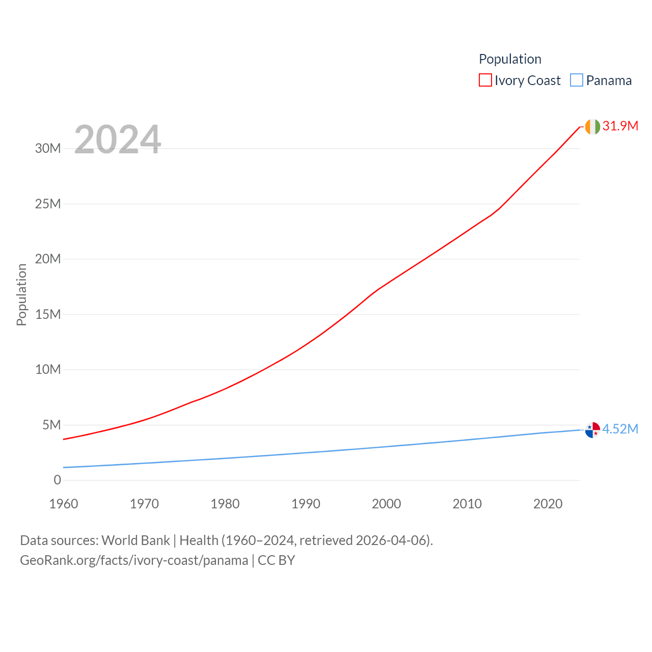 Ivory Coast has a population of 31.9M (ranked 50/197), compared with 4.52M in Panama (ranked 128/197). Ivory Coast's land area is 122,780 sq mi versus 28,641 sq mi for Panama (ranked 66th vs. 115th).