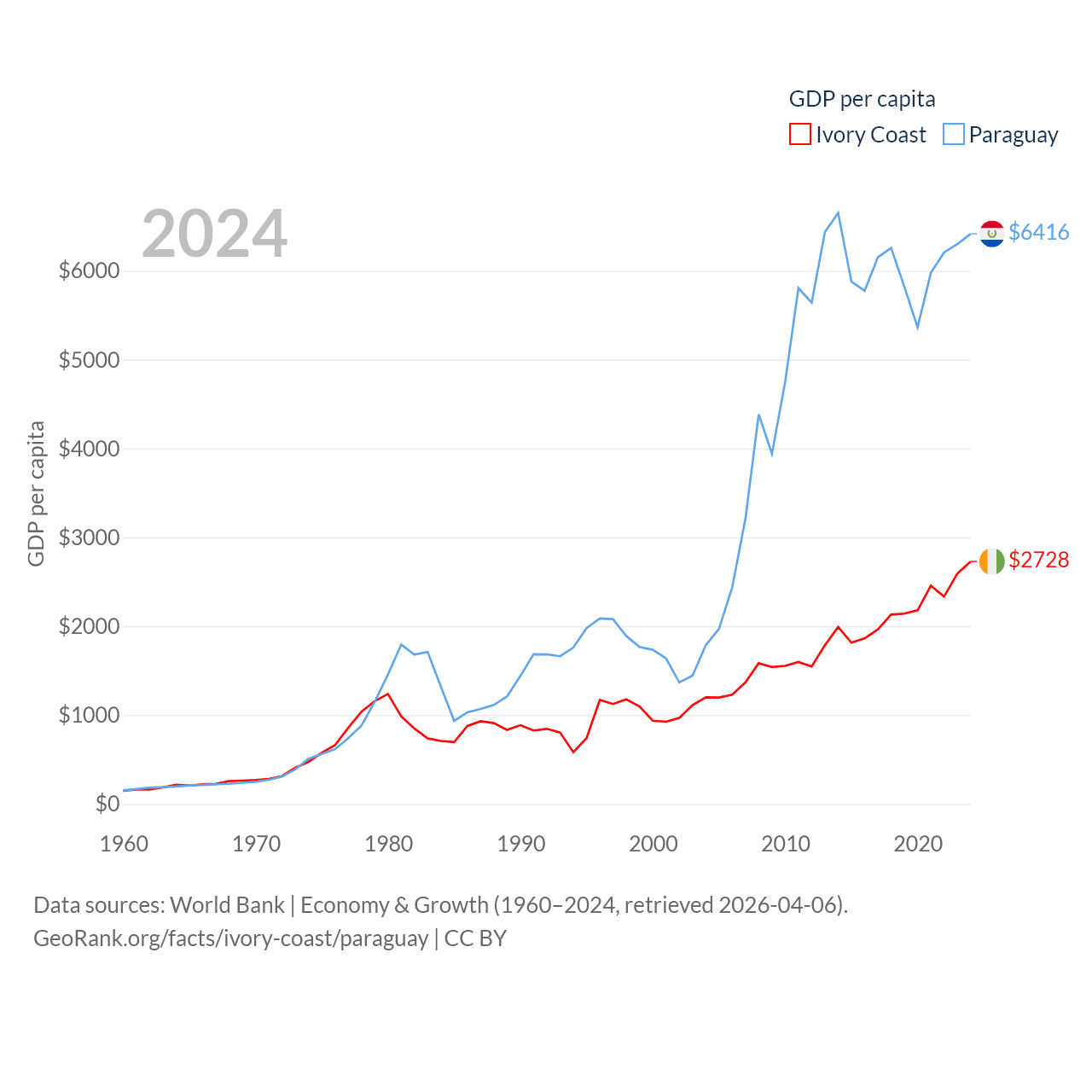 By GDP, Ivory Coast ranks 77/197 ($87.1B) and Paraguay ranks 98/197 ($44.5B). By GDP per capita, Ivory Coast ranks 142/197 ($2,728), while Paraguay ranks 109/197 ($6,416).