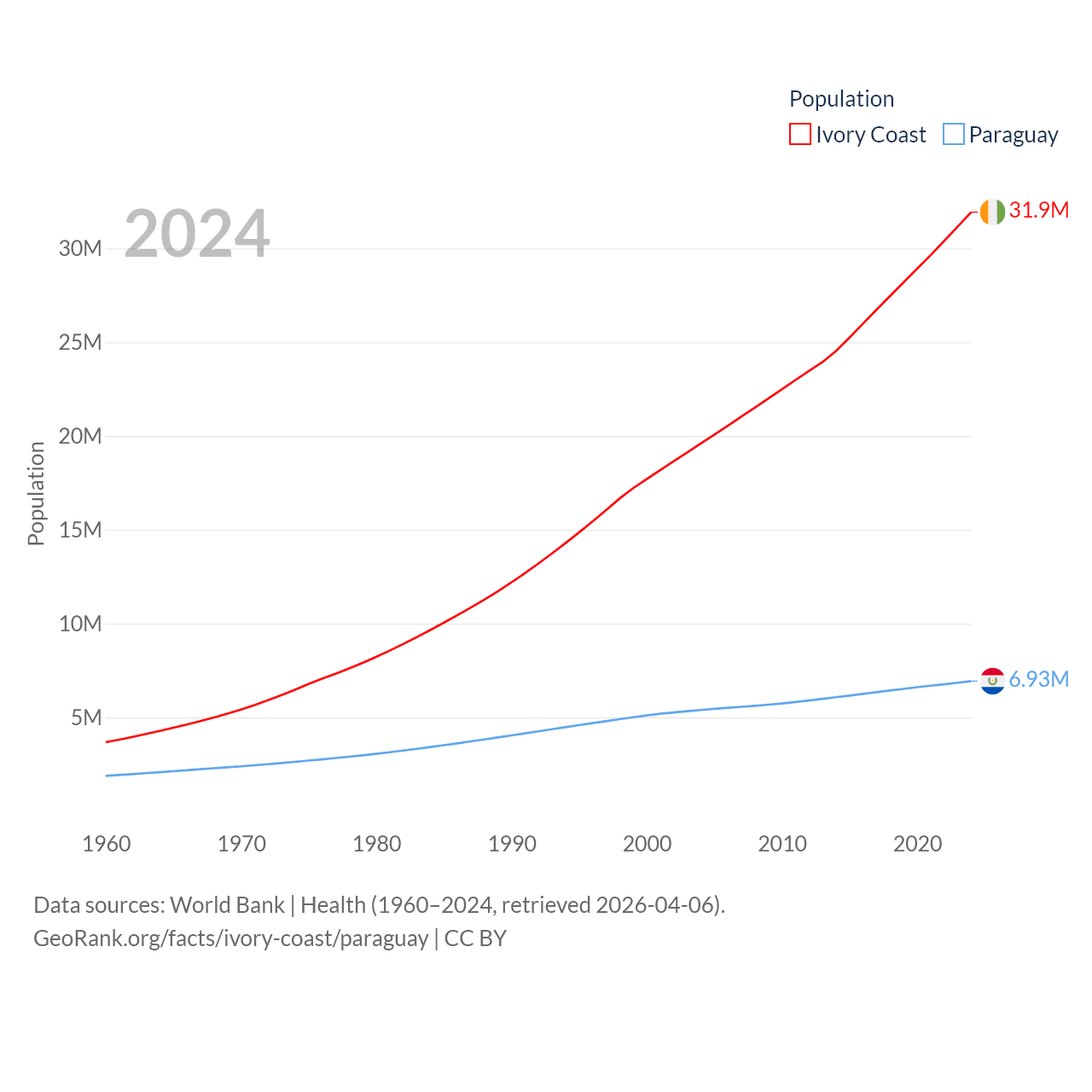 Ivory Coast has a population of 31.9M (ranked 50/197), compared with 6.93M in Paraguay (ranked 107/197). Ivory Coast's land area is 122,780 sq mi versus 152,901 sq mi for Paraguay (ranked 66th vs. 59th).