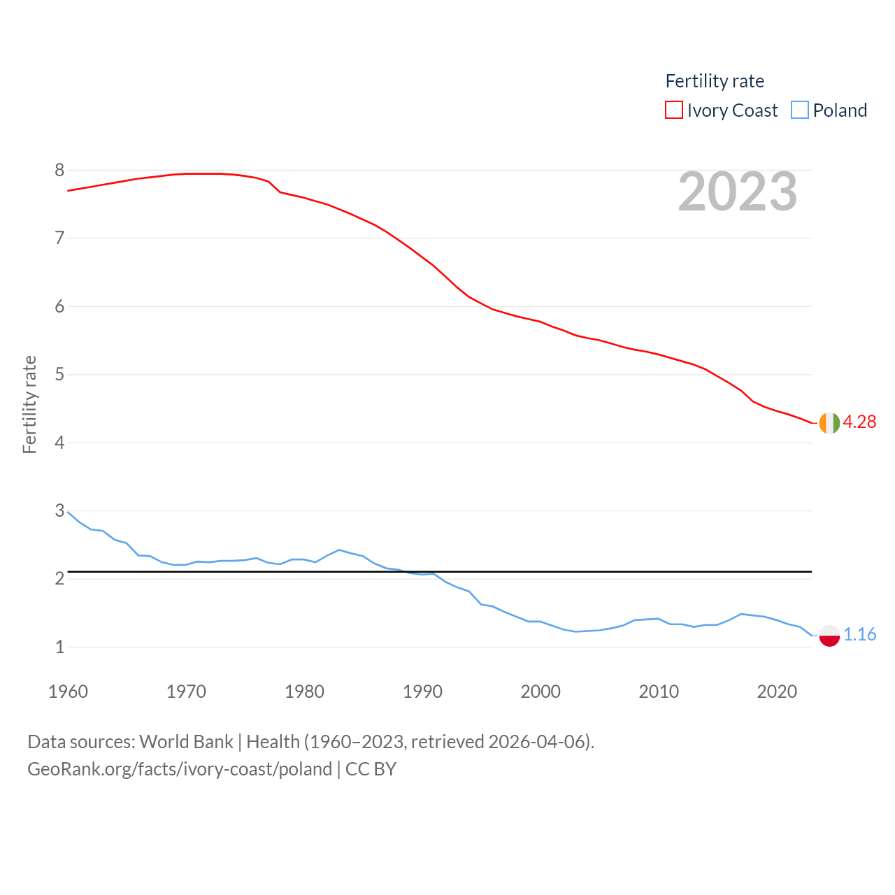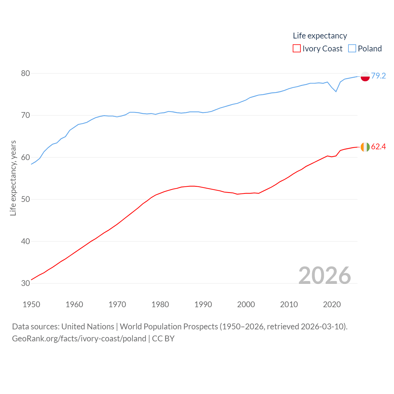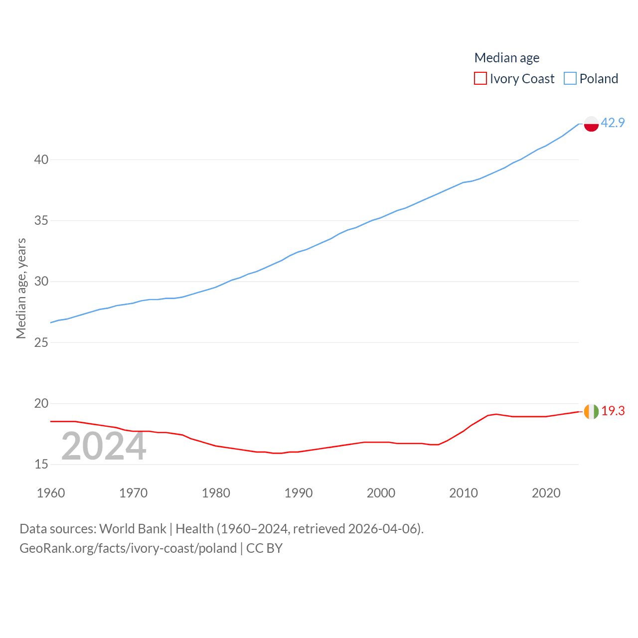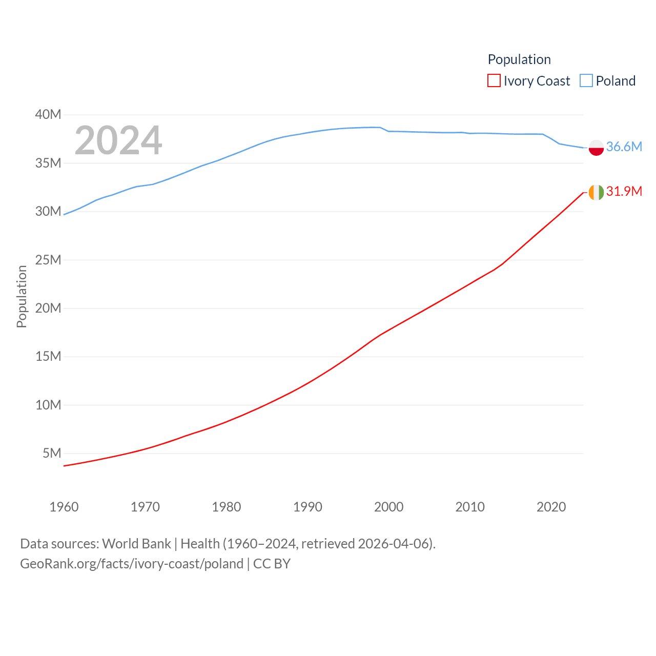 Ivory Coast has a population of 31.9M (ranked 50/197), compared with 36.6M in Poland (ranked 42/197). Ivory Coast's land area is 122,780 sq mi versus 118,252 sq mi for Poland (ranked 66th vs. 69th).