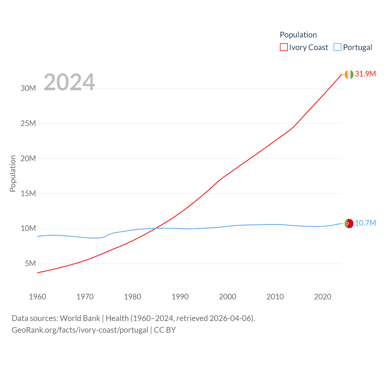 Ivory Coast has a population of 31.9M (ranked 50/197), compared with 10.7M in Portugal (ranked 90/197). Ivory Coast's land area is 122,780 sq mi versus 35,369 sq mi for Portugal (ranked 66th vs. 108th).