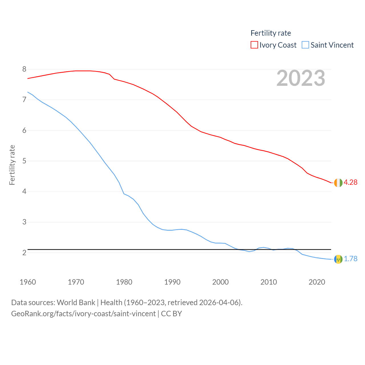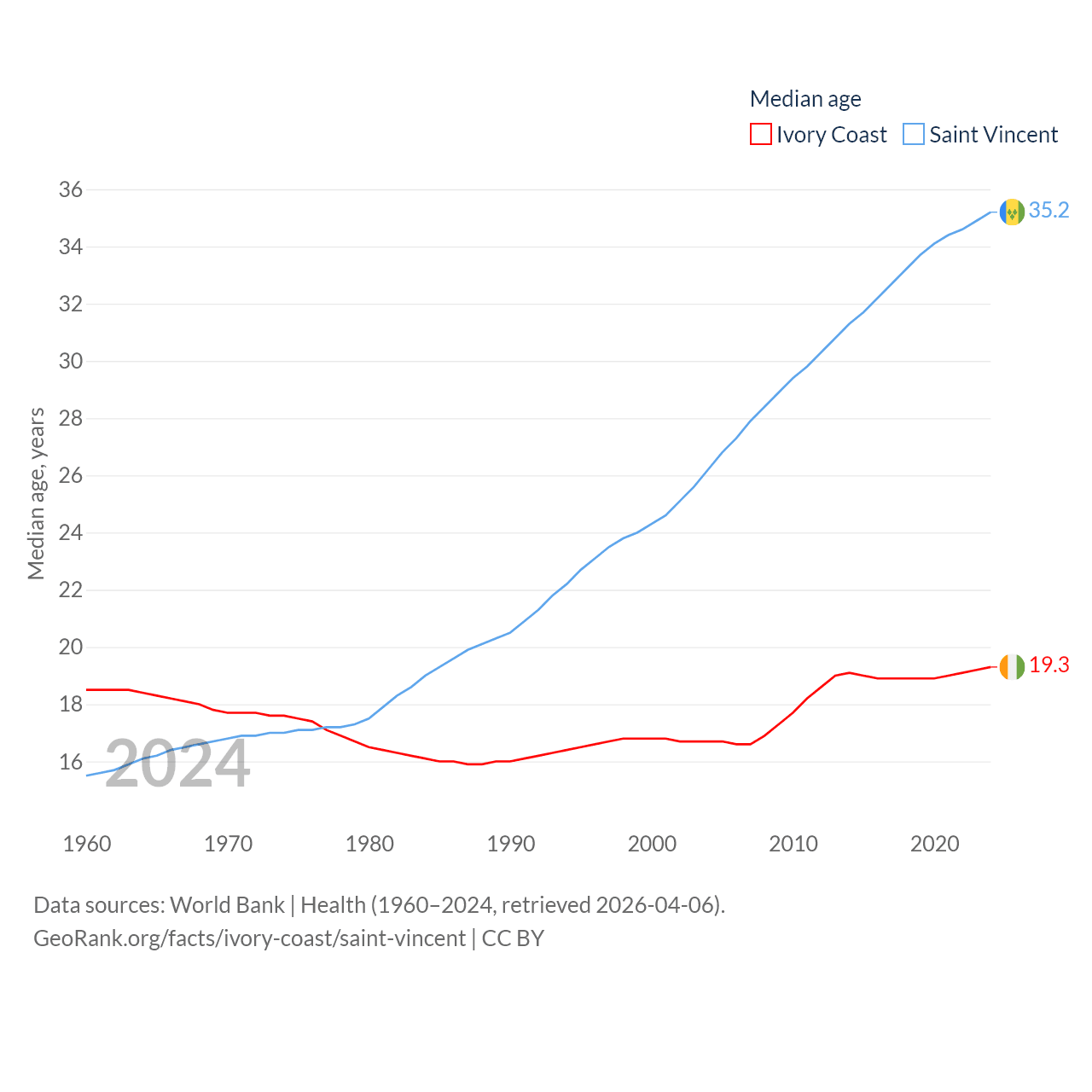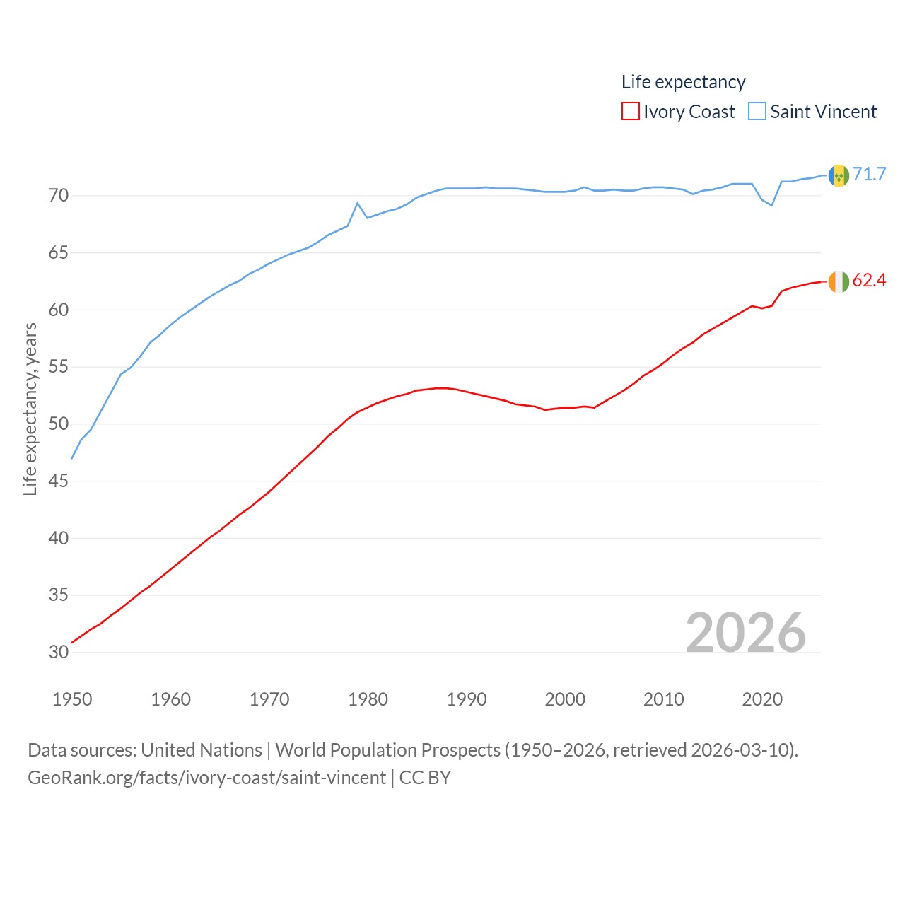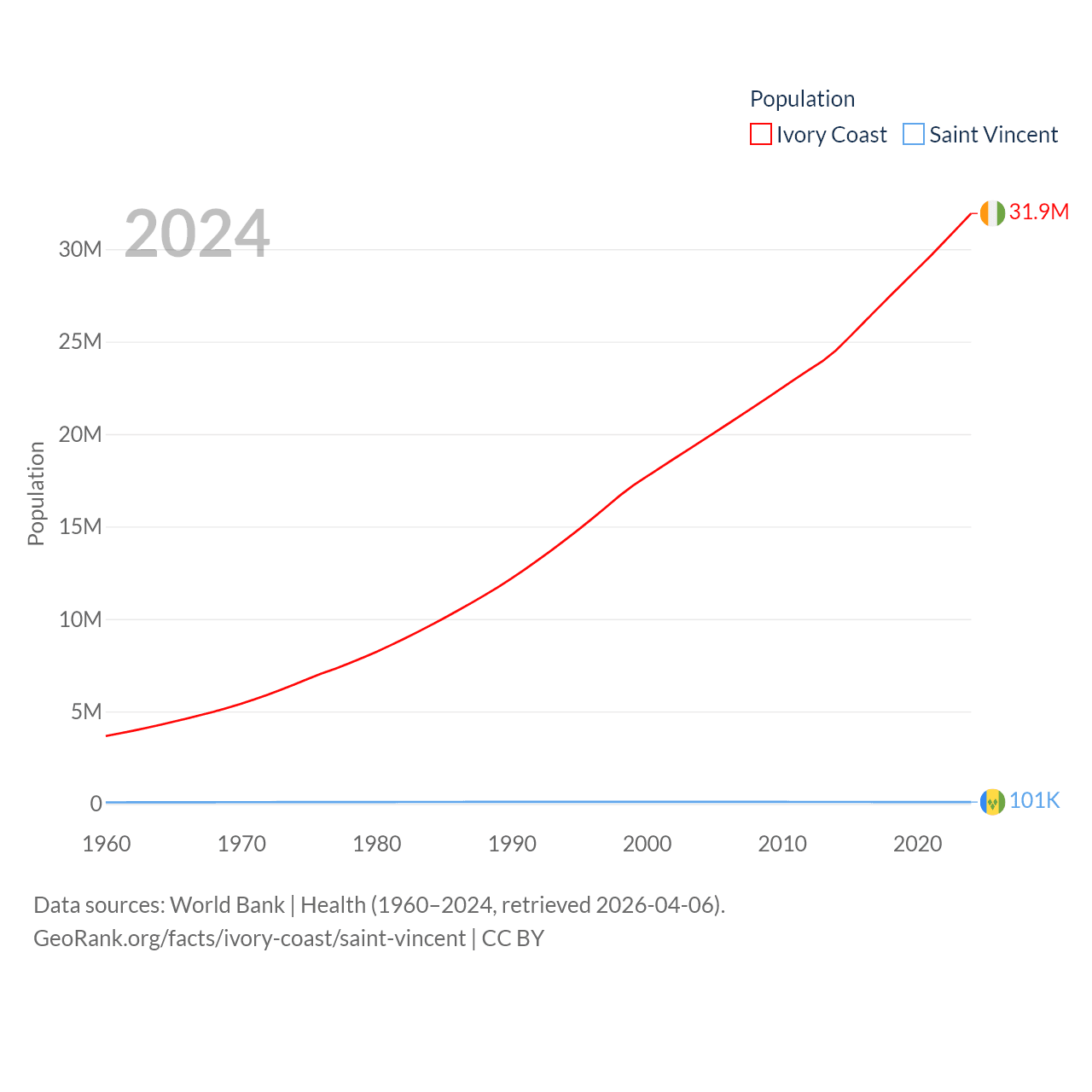 Ivory Coast has a population of 31.9M (ranked 50/197), compared with 101K in Saint Vincent (ranked 184/197). Ivory Coast's land area is 122,780 sq mi versus 150.6 sq mi for Saint Vincent (ranked 66th vs. 185th).
