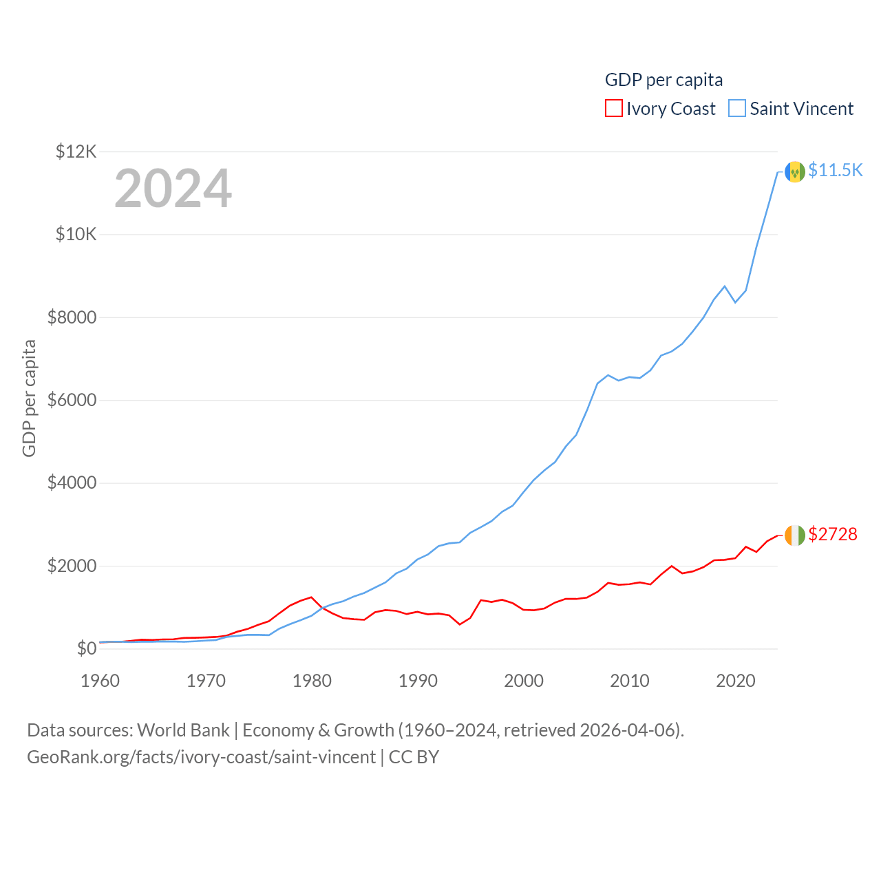 By GDP, Ivory Coast ranks 77/197 ($87.1B) and Saint Vincent ranks 186/197 ($1.16B). By GDP per capita, Ivory Coast ranks 142/197 ($2,728), while Saint Vincent ranks 81/197 ($11,501).
