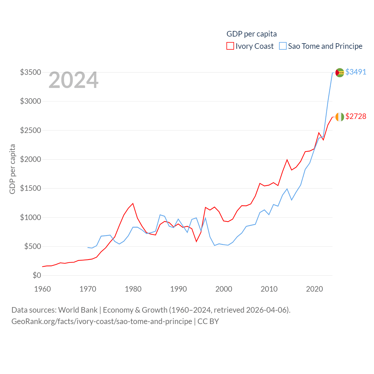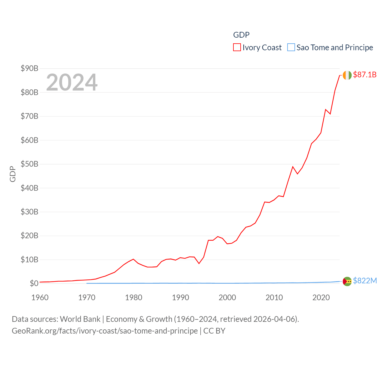 By GDP, Ivory Coast ranks 77/197 ($87.1B) and Sao Tome and Principe ranks 189/197 ($822M). By GDP per capita, Ivory Coast ranks 142/197 ($2,728), while Sao Tome and Principe ranks 134/197 ($3,491).