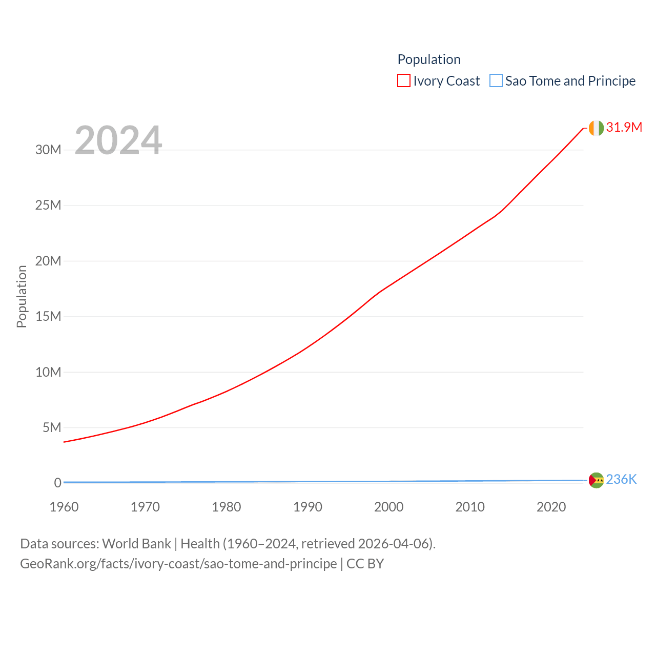 Ivory Coast has a population of 31.9M (ranked 50/197), compared with 236K in Sao Tome and Principe (ranked 176/197). Ivory Coast's land area is 122,780 sq mi versus 371 sq mi for Sao Tome and Principe (ranked 66th vs. 172nd).