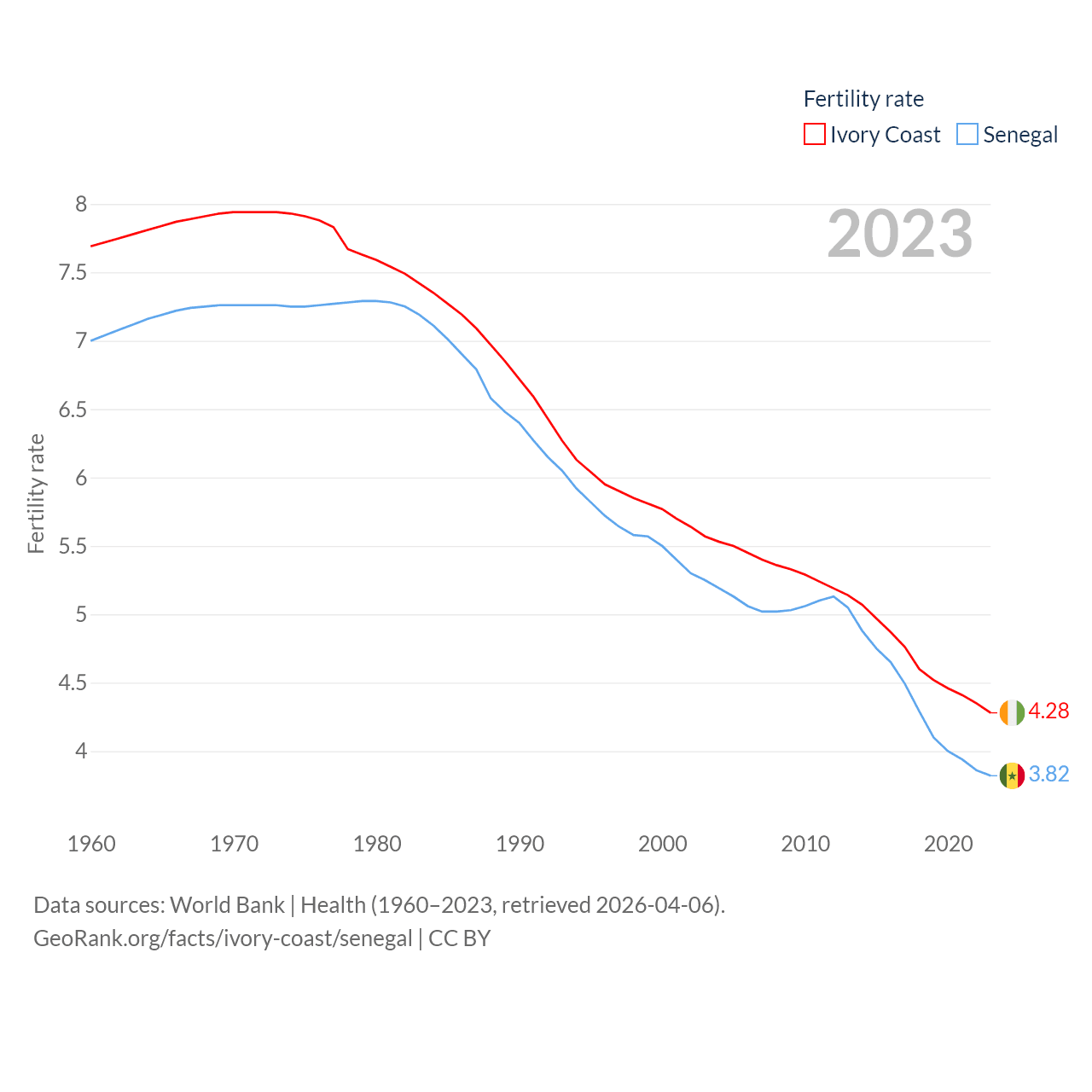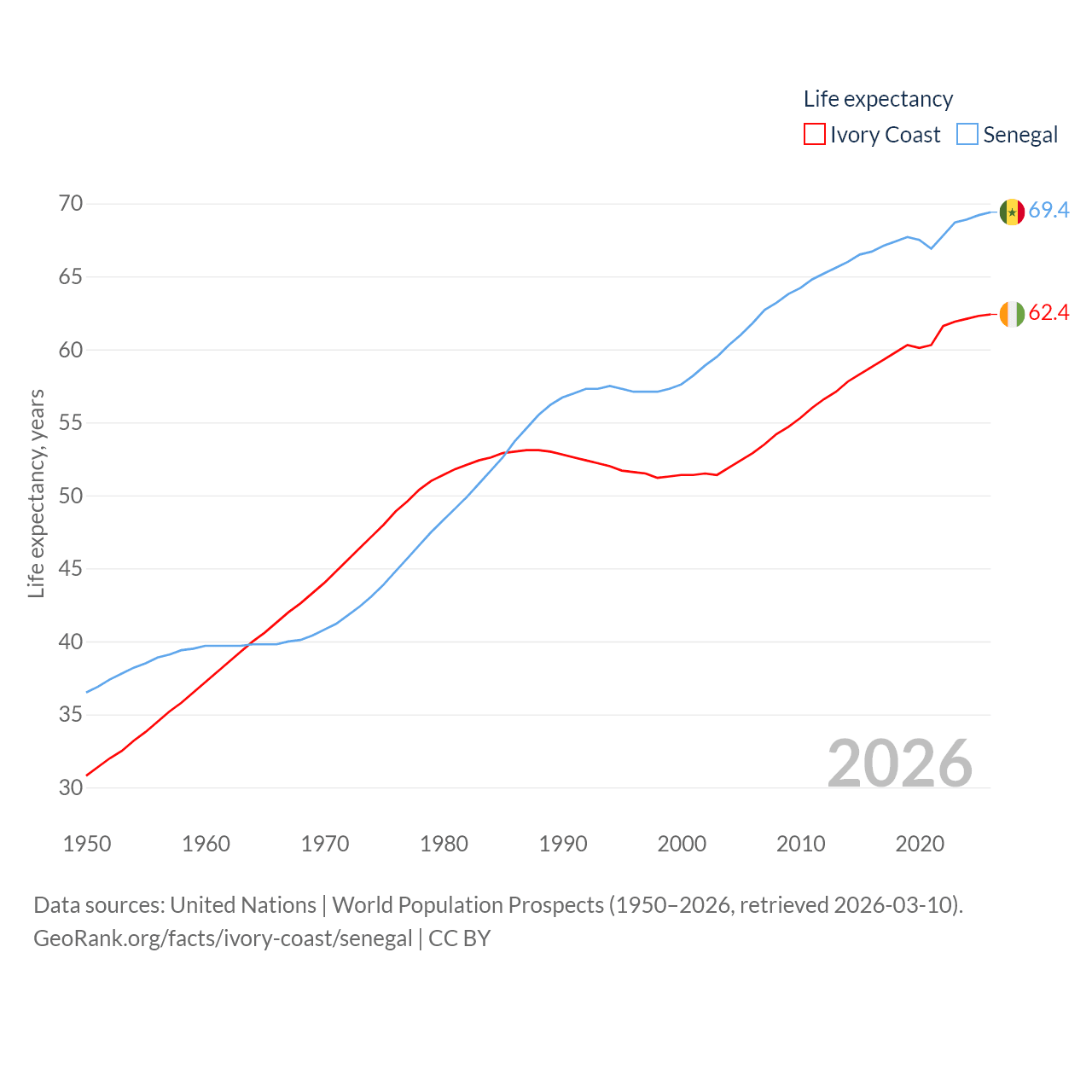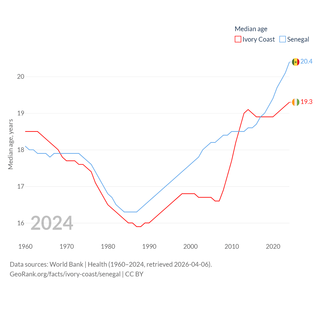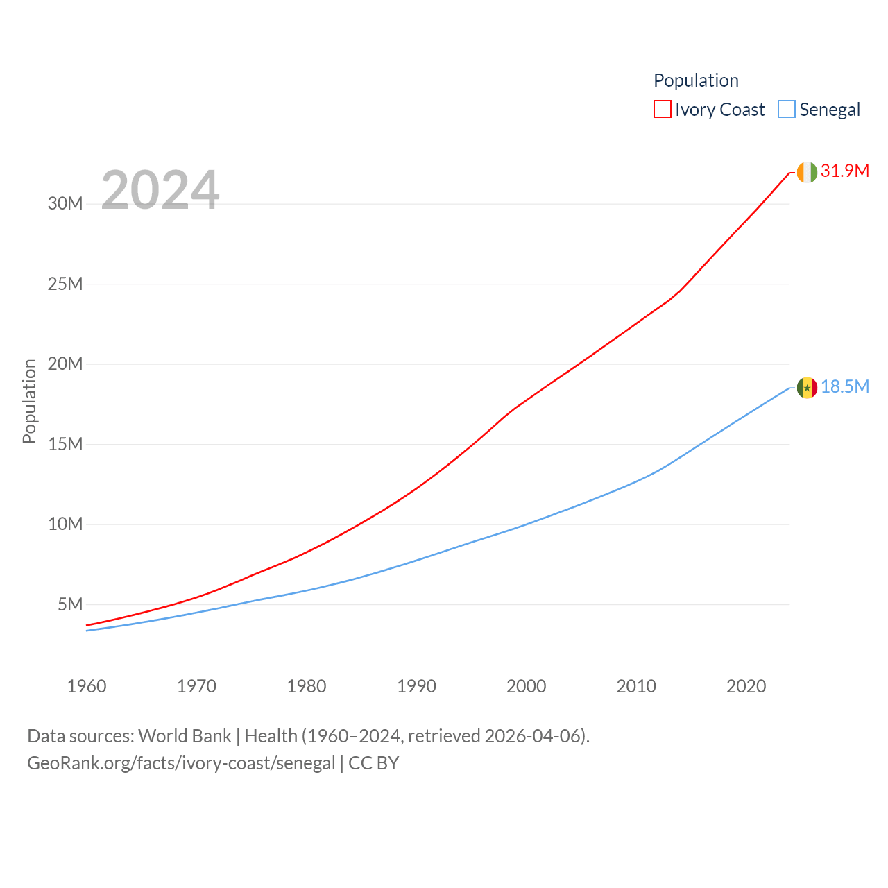 Ivory Coast has a population of 31.9M (ranked 50/197), compared with 18.5M in Senegal (ranked 69/197). Ivory Coast's land area is 122,780 sq mi versus 74,336 sq mi for Senegal (ranked 66th vs. 85th).