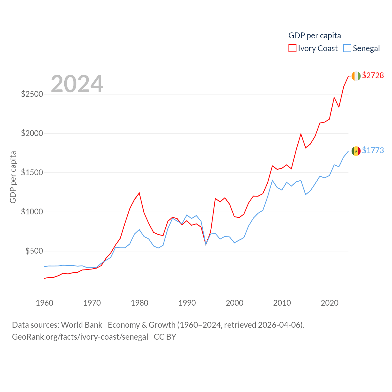 By GDP, Ivory Coast ranks 77/197 ($87.1B) and Senegal ranks 109/197 ($32.8B). By GDP per capita, Ivory Coast ranks 142/197 ($2,728), while Senegal ranks 159/197 ($1,773).