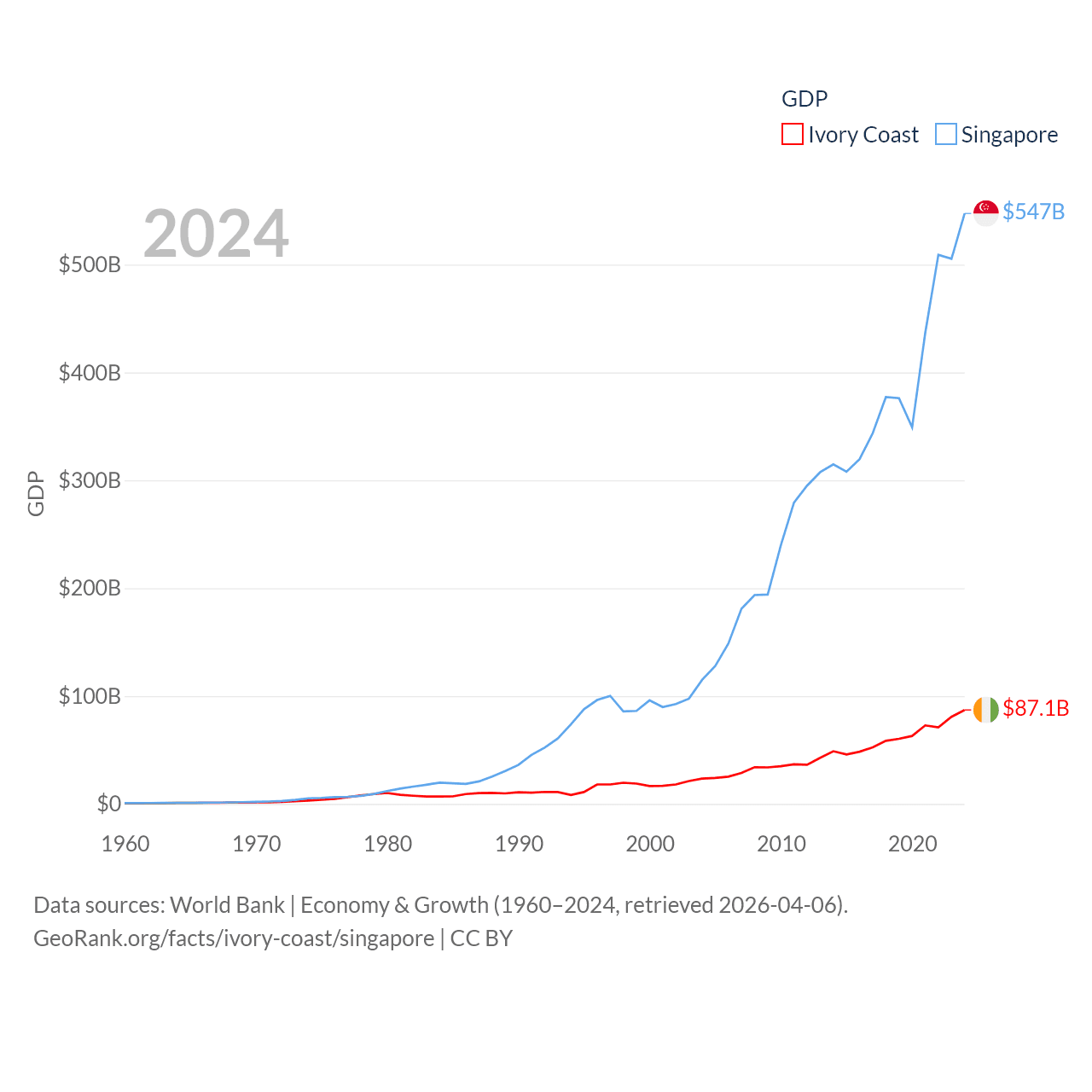 By GDP, Ivory Coast ranks 77/197 ($87.1B) and Singapore ranks 28/197 ($547B). By GDP per capita, Ivory Coast ranks 142/197 ($2,728), while Singapore ranks 7/197 ($90,674).