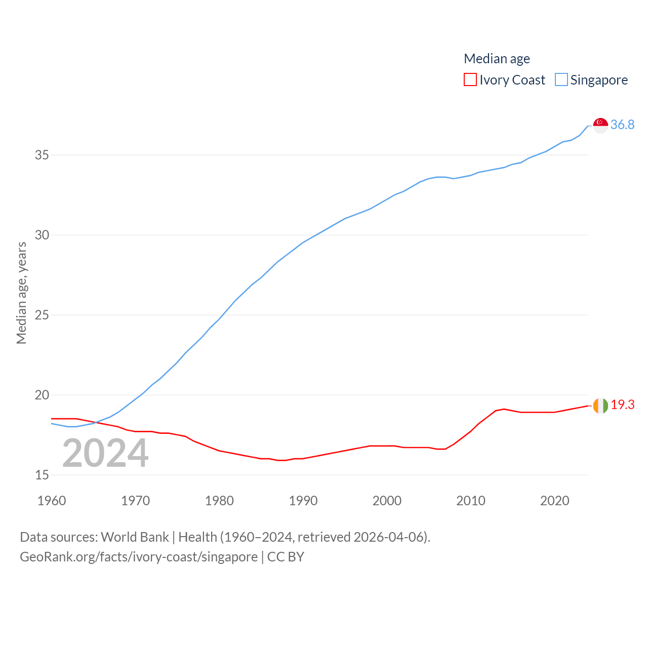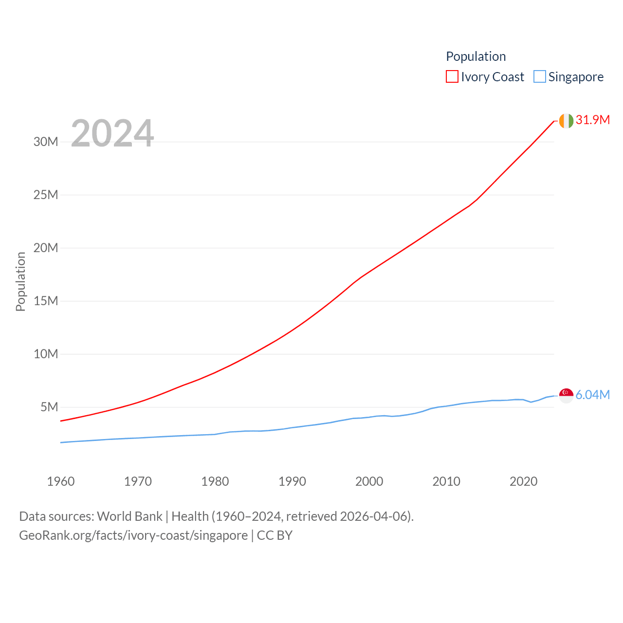 Ivory Coast has a population of 31.9M (ranked 50/197), compared with 6.04M in Singapore (ranked 113/197). Ivory Coast's land area is 122,780 sq mi versus 277.2 sq mi for Singapore (ranked 66th vs. 177th).