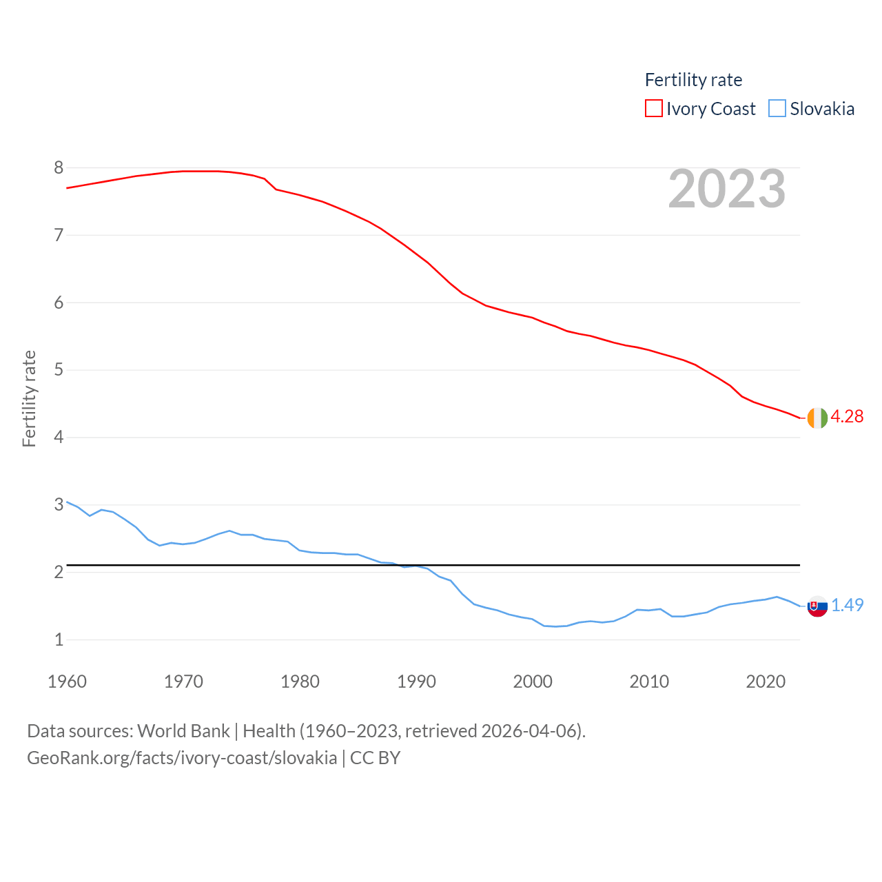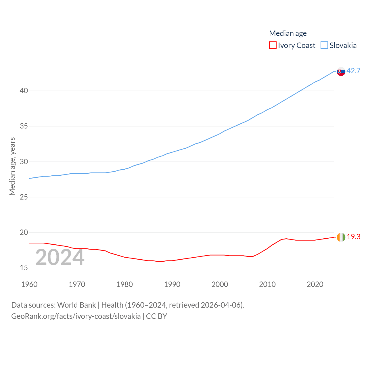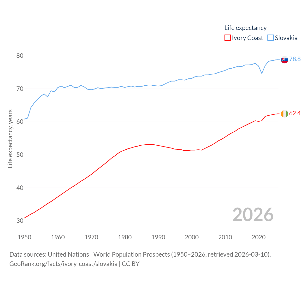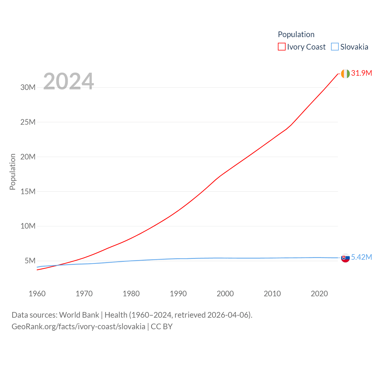 Ivory Coast has a population of 31.9M (ranked 50/197), compared with 5.42M in Slovakia (ranked 119/197). Ivory Coast's land area is 122,780 sq mi versus 18,564 sq mi for Slovakia (ranked 66th vs. 128th).