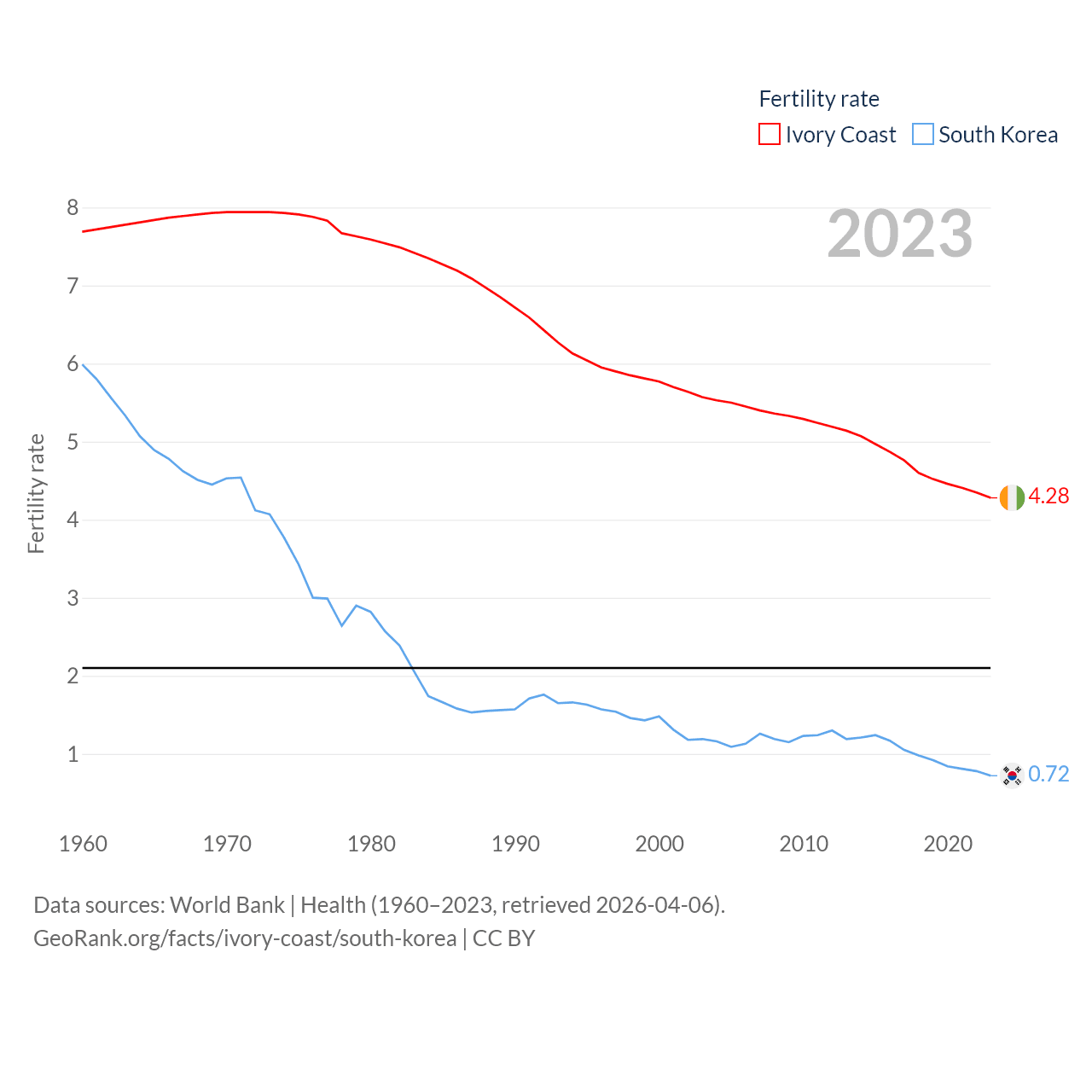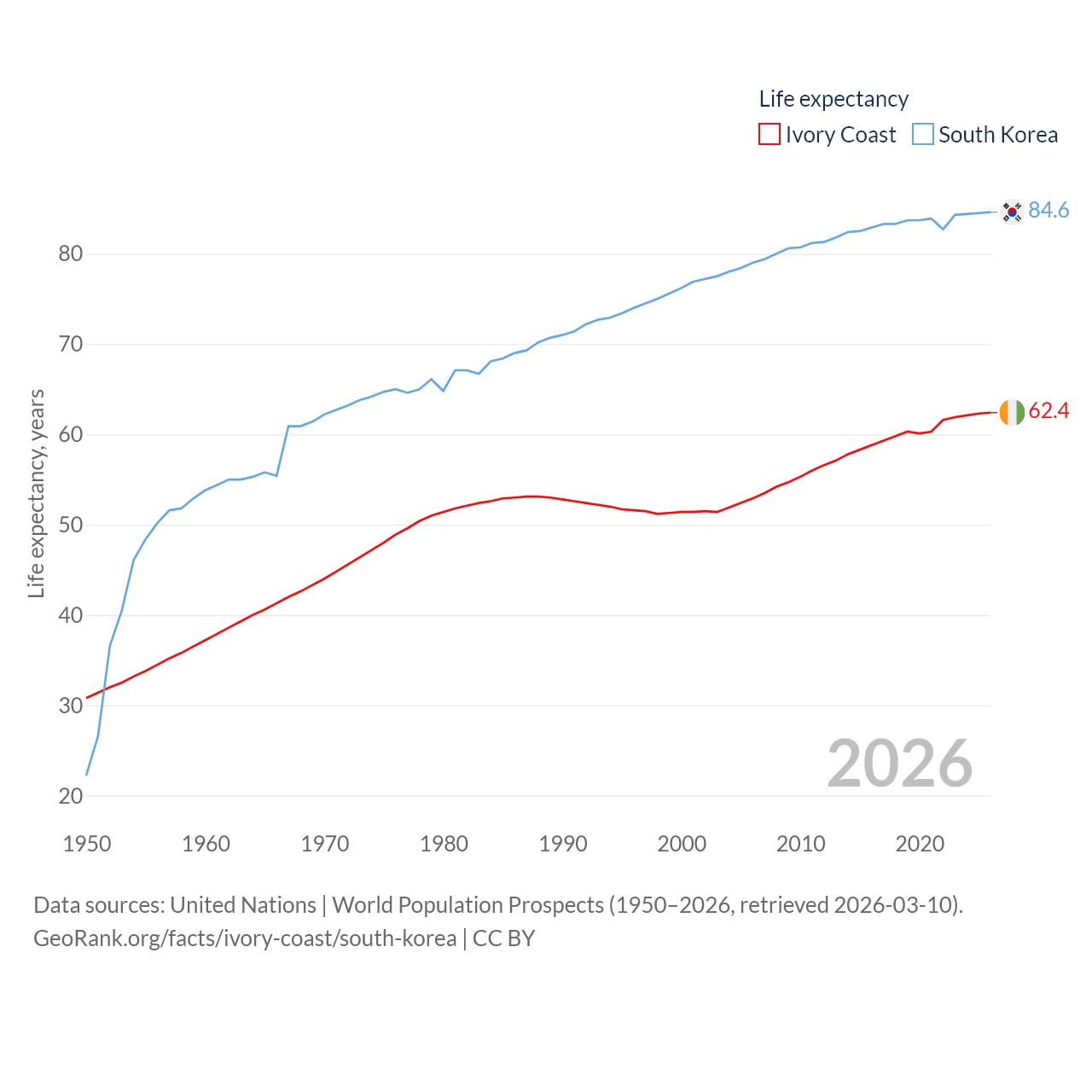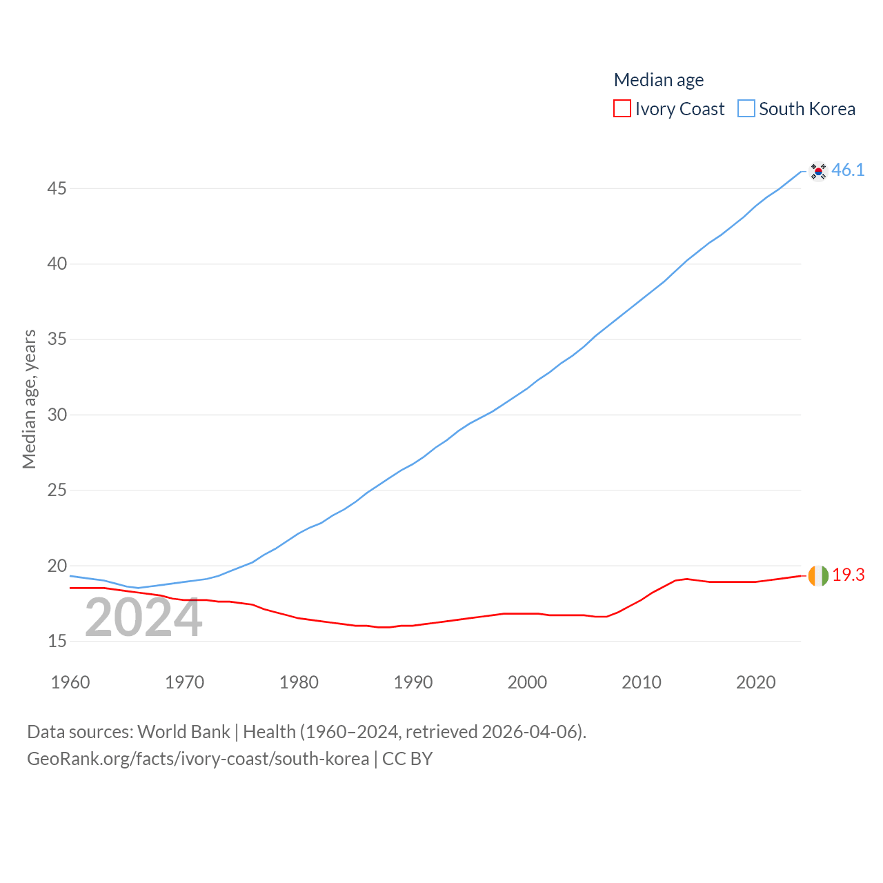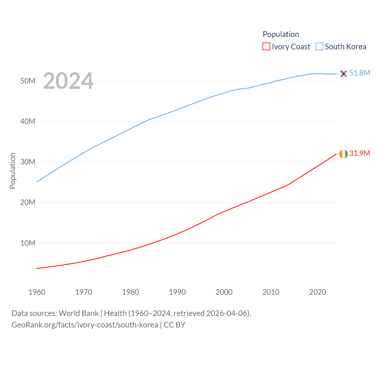 Ivory Coast has a population of 31.9M (ranked 50/197), compared with 51.8M in South Korea (ranked 29/197). Ivory Coast's land area is 122,780 sq mi versus 37,684 sq mi for South Korea (ranked 66th vs. 105th).