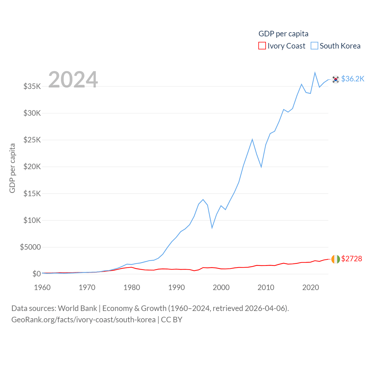 By GDP, Ivory Coast ranks 77/197 ($87.1B) and South Korea ranks 12/197 ($1.88T). By GDP per capita, Ivory Coast ranks 142/197 ($2,728), while South Korea ranks 31/197 ($36,239).