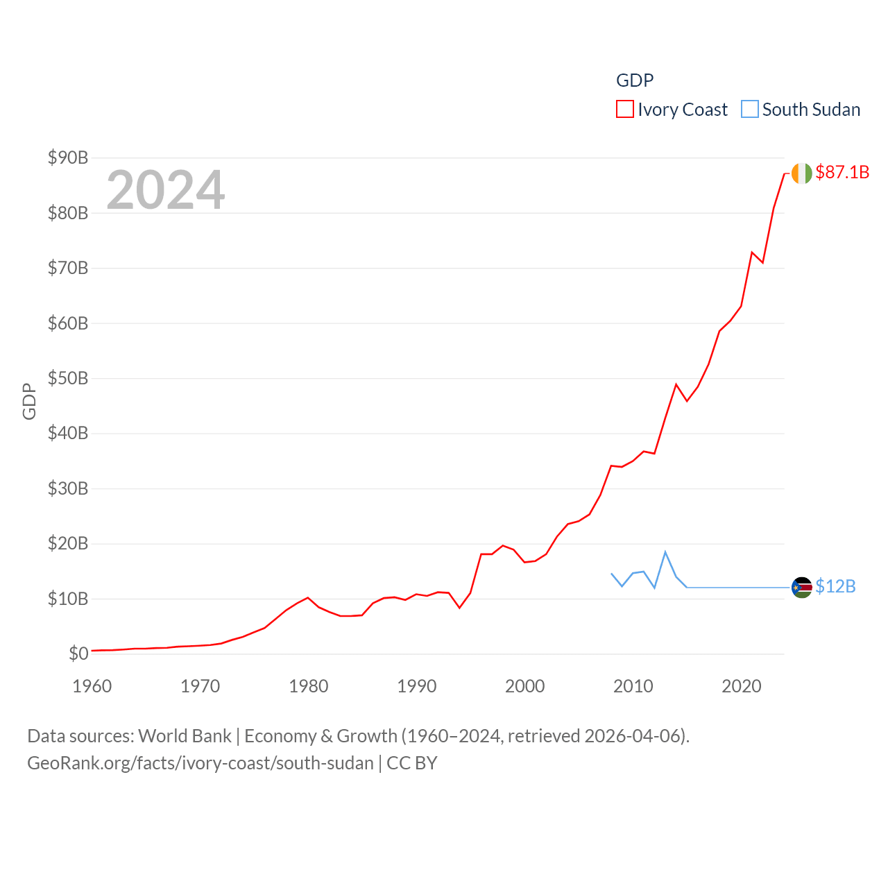 By GDP, Ivory Coast ranks 77/197 ($87.1B) and South Sudan ranks 149/197 ($12B). By GDP per capita, Ivory Coast ranks 142/197 ($2,728), while South Sudan ranks 175/197 ($1,080).