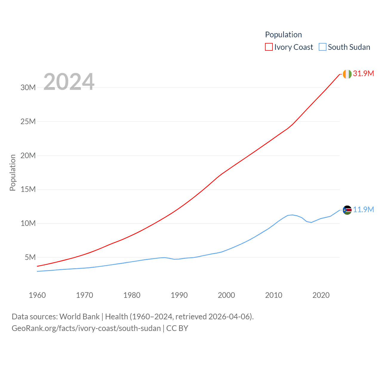 Ivory Coast has a population of 31.9M (ranked 50/197), compared with 11.9M in South Sudan (ranked 81/197). Ivory Coast's land area is 122,780 sq mi versus 243,990 sq mi for South Sudan (ranked 66th vs. 41st).