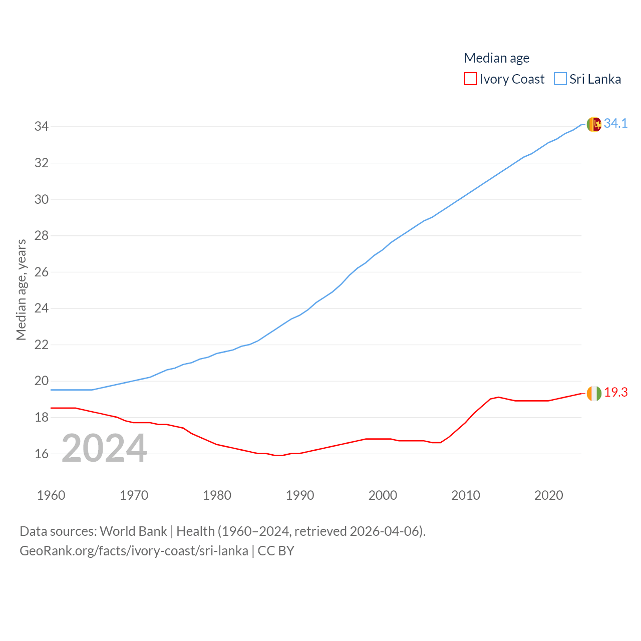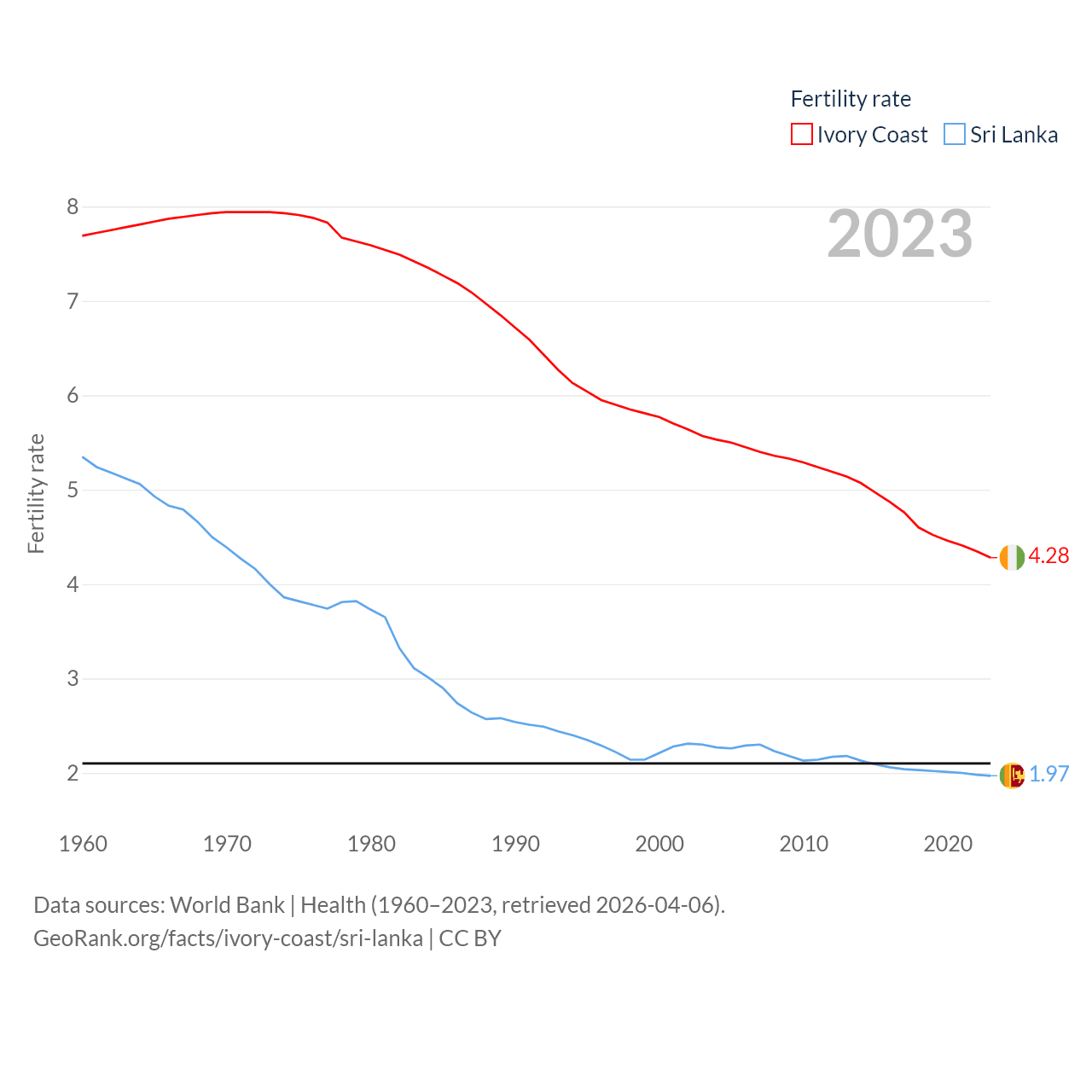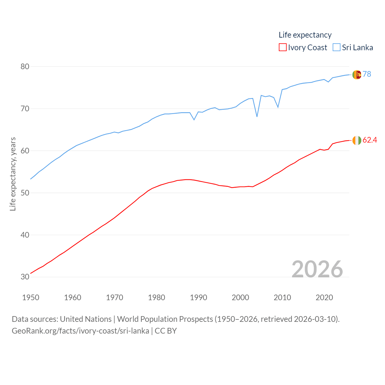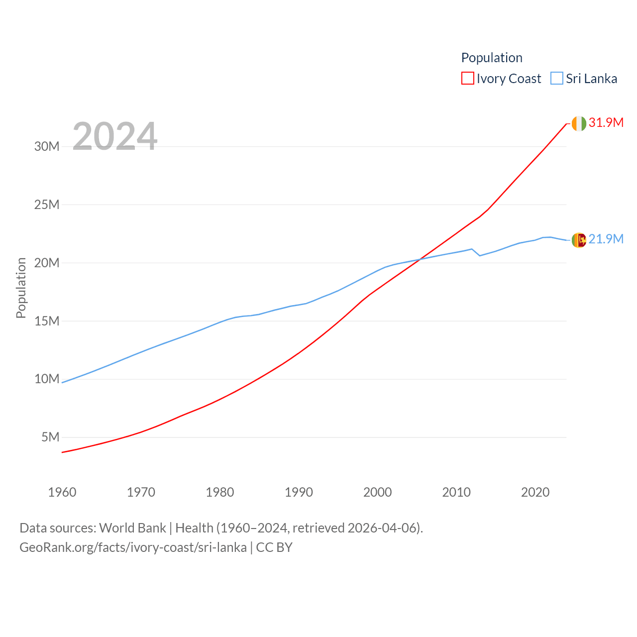 Ivory Coast has a population of 31.9M (ranked 50/197), compared with 21.9M in Sri Lanka (ranked 61/197). Ivory Coast's land area is 122,780 sq mi versus 23,884 sq mi for Sri Lanka (ranked 66th vs. 122nd).