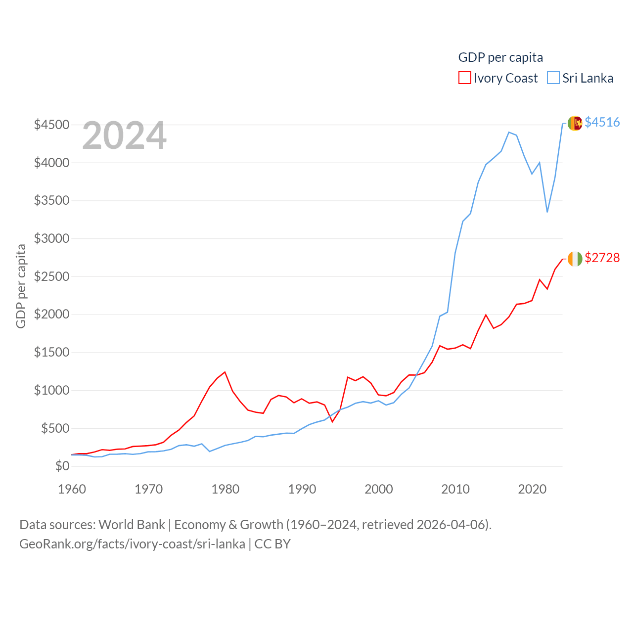By GDP, Ivory Coast ranks 77/197 ($87.1B) and Sri Lanka ranks 72/197 ($99B). By GDP per capita, Ivory Coast ranks 142/197 ($2,728), while Sri Lanka ranks 124/197 ($4,516).