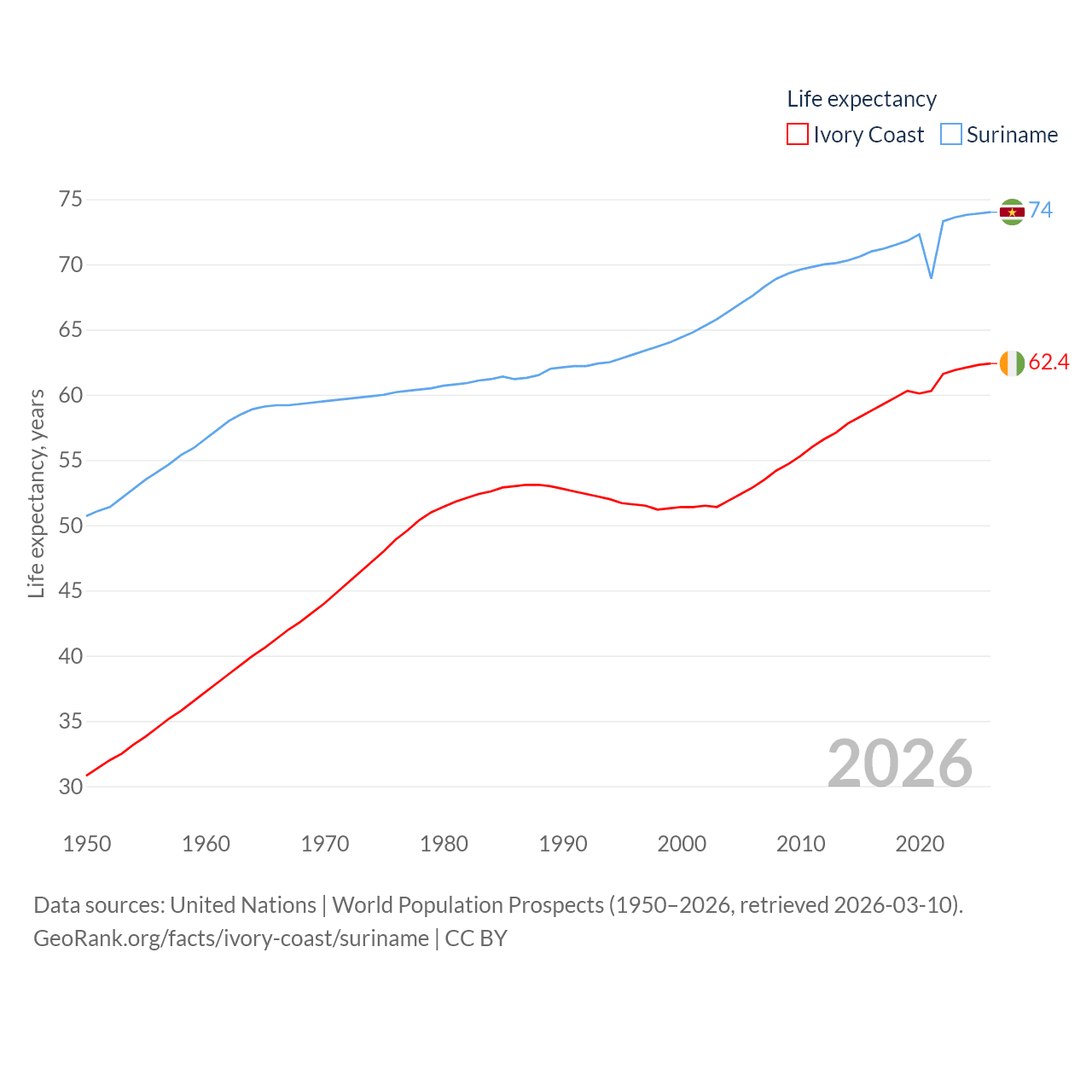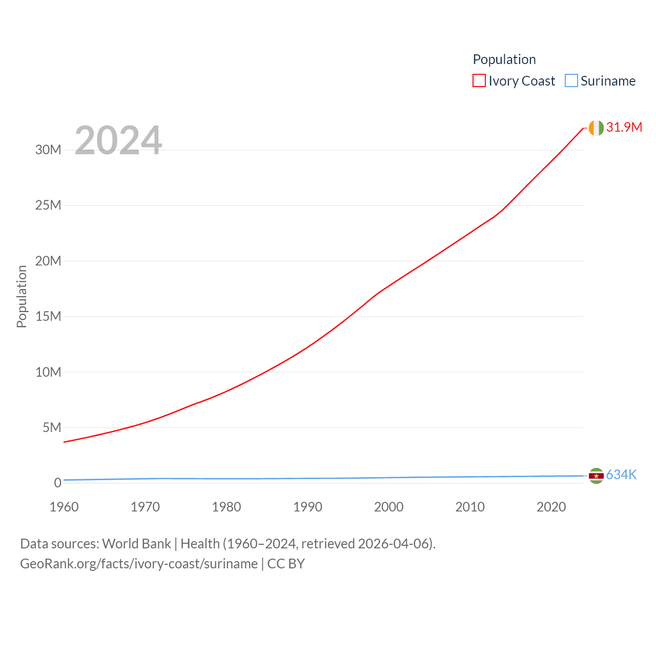 Ivory Coast has a population of 31.9M (ranked 50/197), compared with 634K in Suriname (ranked 165/197). Ivory Coast's land area is 122,780 sq mi versus 61,972 sq mi for Suriname (ranked 66th vs. 90th).
