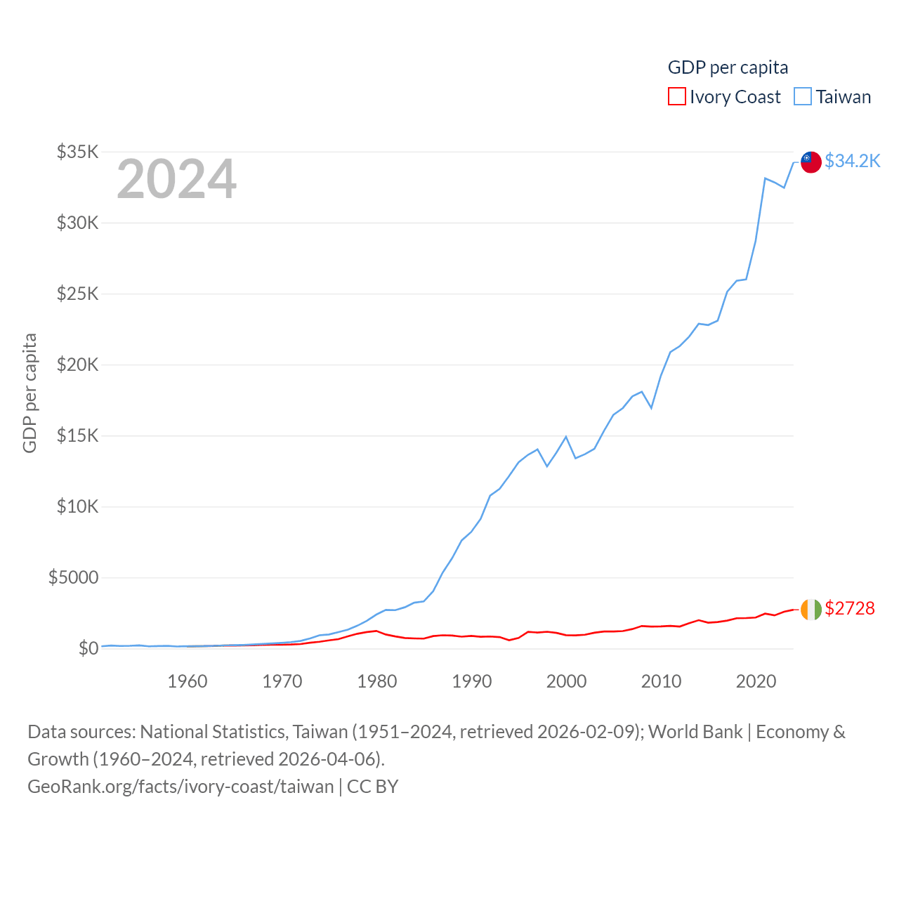 By GDP, Ivory Coast ranks 77/197 ($87.1B) and Taiwan ranks 22/197 ($802B). By GDP per capita, Ivory Coast ranks 142/197 ($2,728), while Taiwan ranks 35/197 ($34,238).