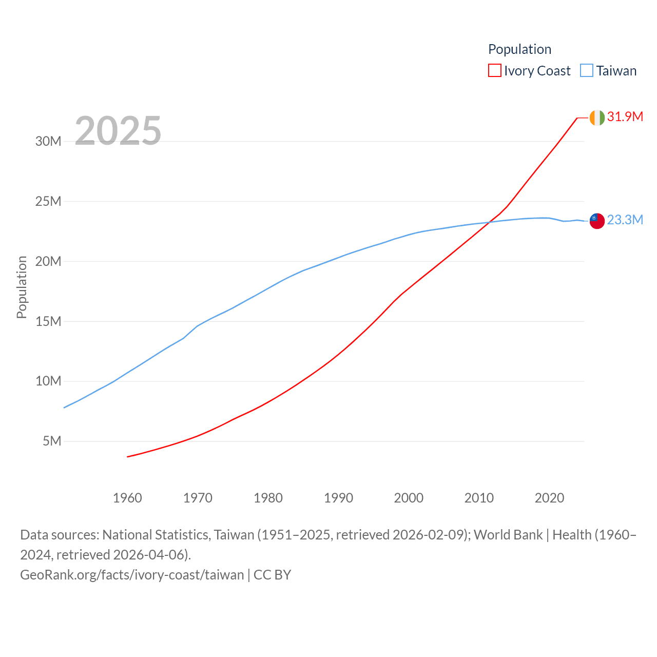 Ivory Coast has a population of 31.9M (ranked 50/197), compared with 23.3M in Taiwan (ranked 60/197). Ivory Coast's land area is 122,780 sq mi versus 13,976 sq mi for Taiwan (ranked 66th vs. 133rd).