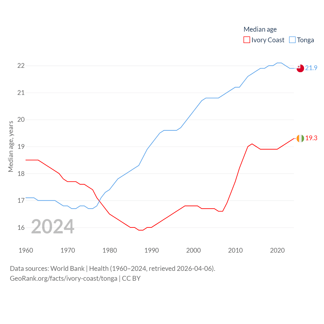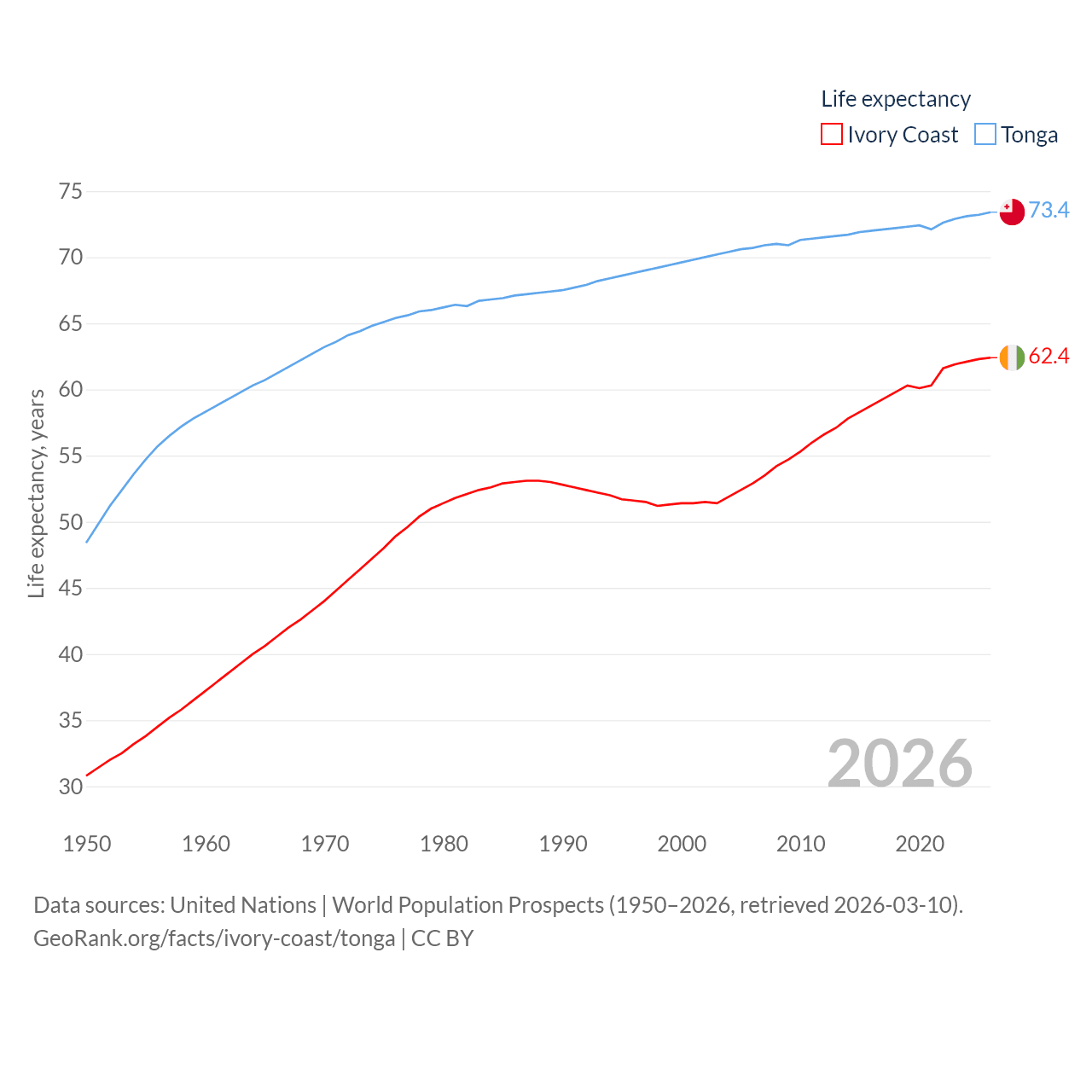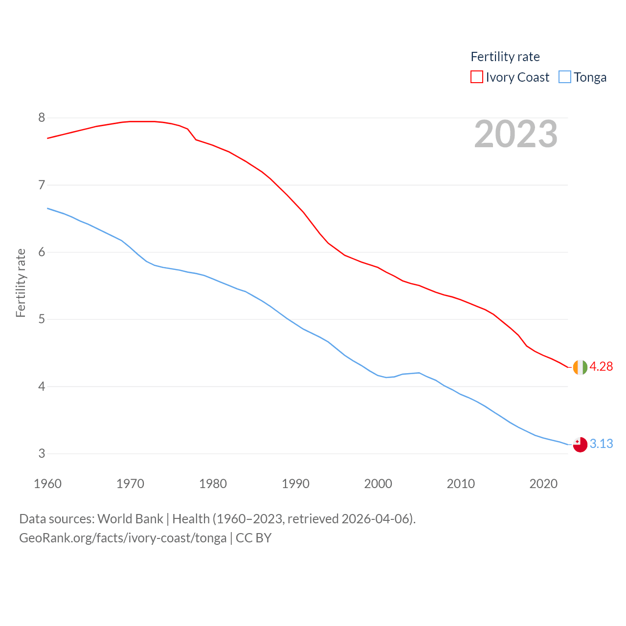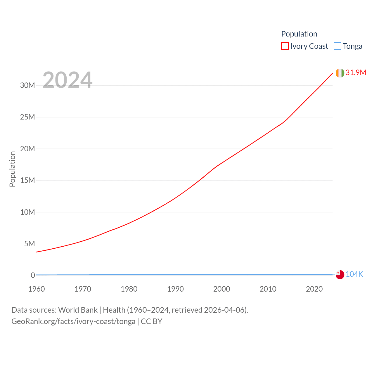 Ivory Coast has a population of 31.9M (ranked 50/197), compared with 104K in Tonga (ranked 183/197). Ivory Coast's land area is 122,780 sq mi versus 278 sq mi for Tonga (ranked 66th vs. 176th).
