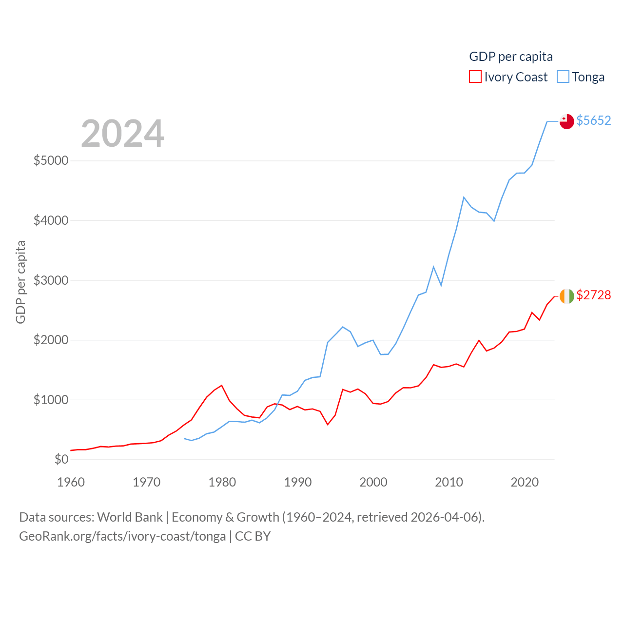 By GDP, Ivory Coast ranks 77/197 ($87.1B) and Tonga ranks 191/197 ($591M). By GDP per capita, Ivory Coast ranks 142/197 ($2,728), while Tonga ranks 115/197 ($5,652).