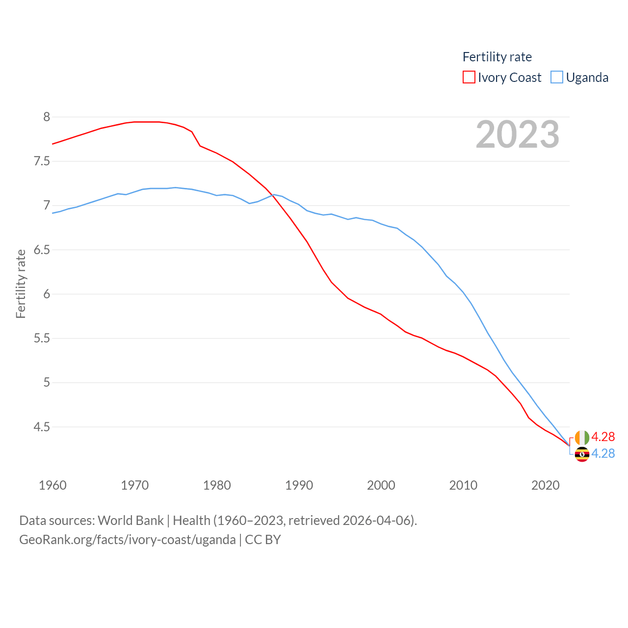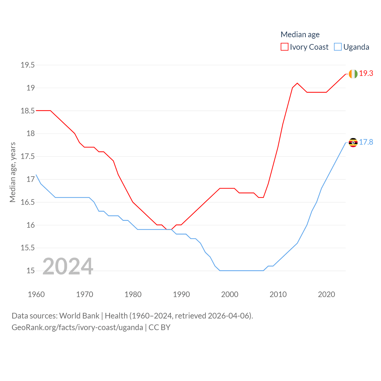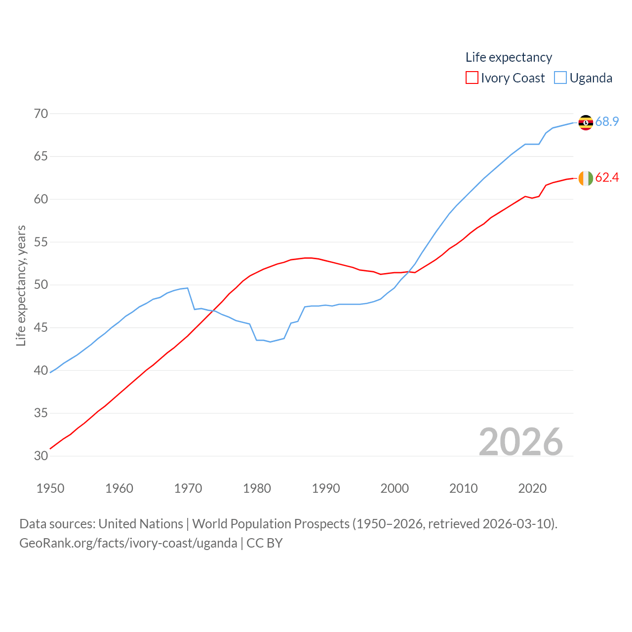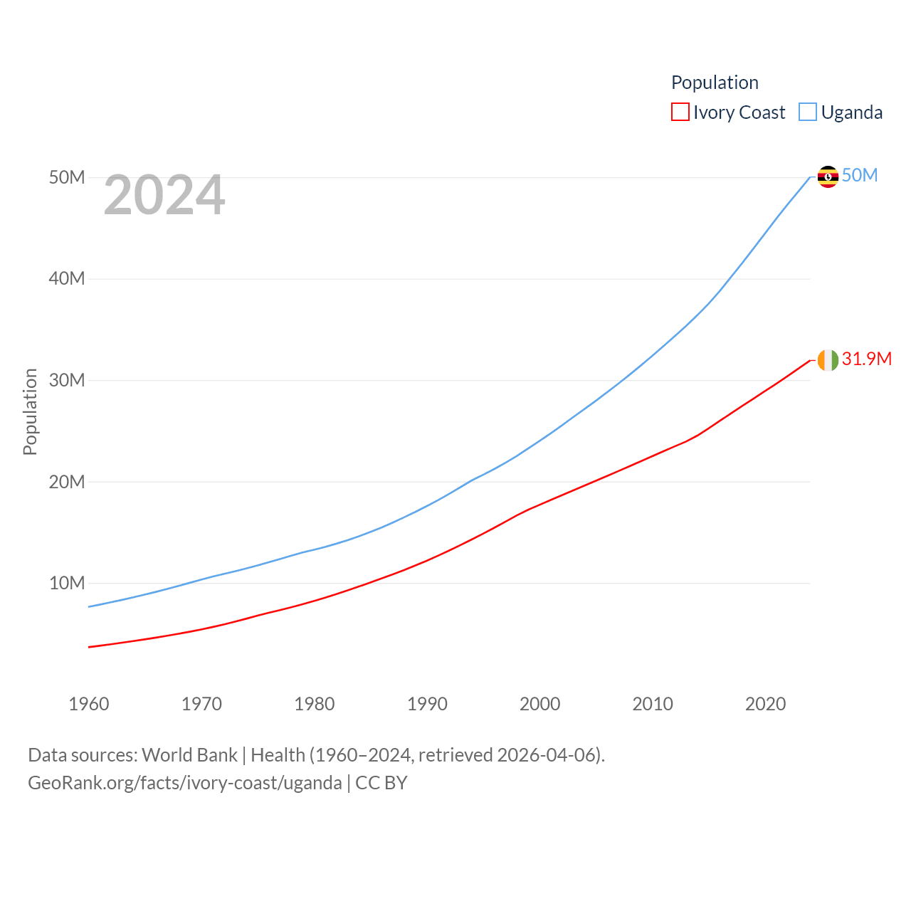 Ivory Coast has a population of 31.9M (ranked 50/197), compared with 50M in Uganda (ranked 31/197). Ivory Coast's land area is 122,780 sq mi versus 77,421 sq mi for Uganda (ranked 66th vs. 84th).