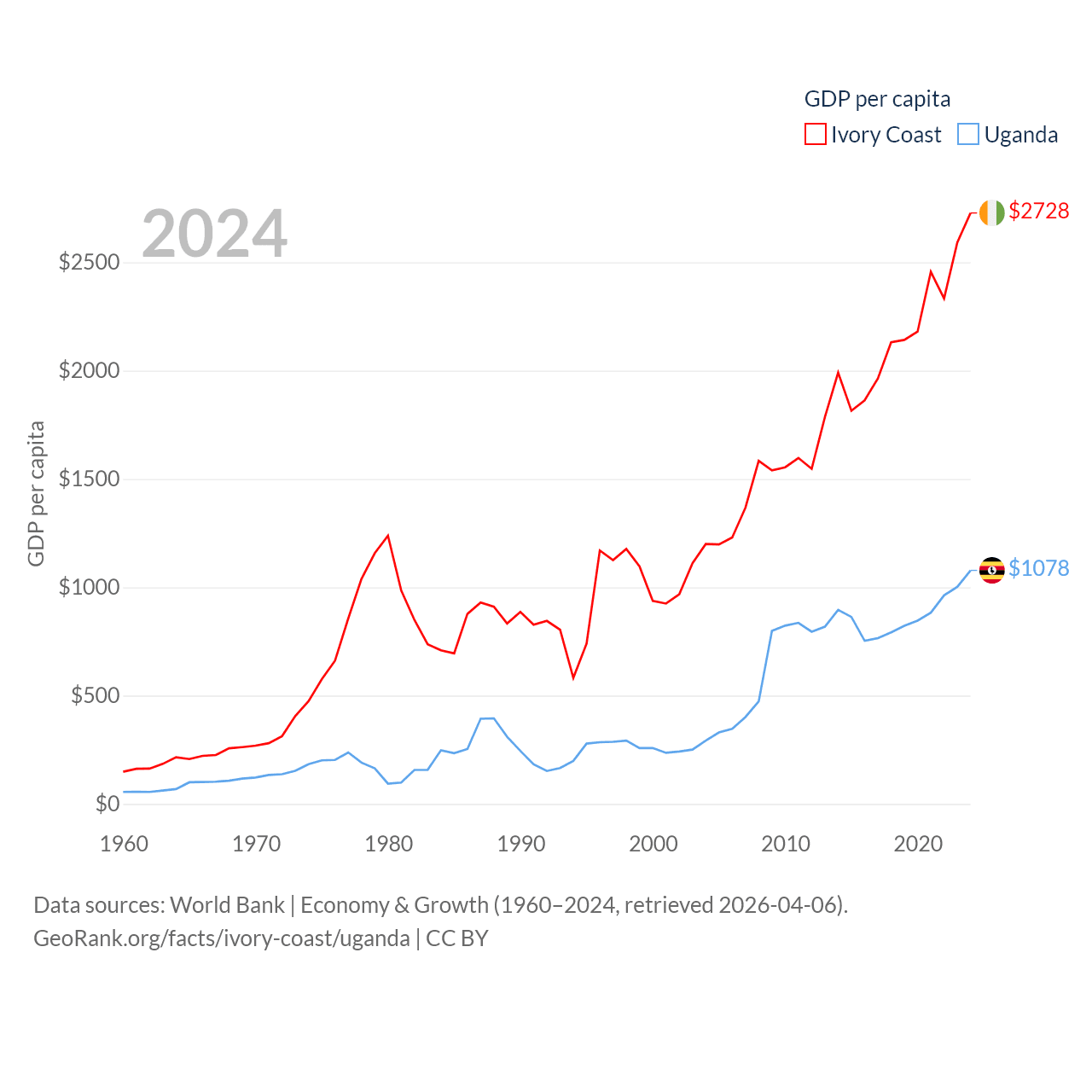 By GDP, Ivory Coast ranks 77/197 ($87.1B) and Uganda ranks 89/197 ($53.9B). By GDP per capita, Ivory Coast ranks 142/197 ($2,728), while Uganda ranks 176/197 ($1,078).