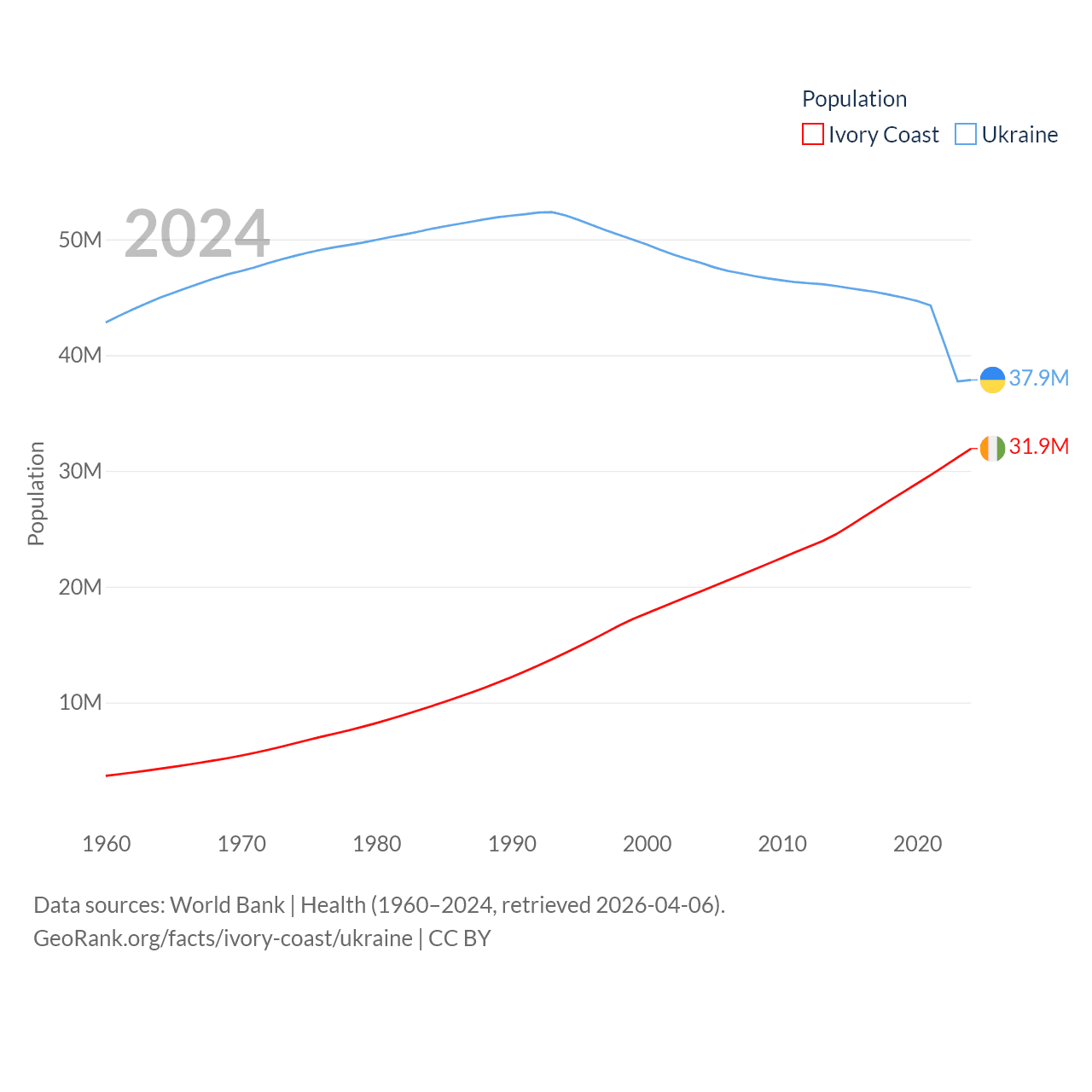 Ivory Coast has a population of 31.9M (ranked 50/197), compared with 37.9M in Ukraine (ranked 41/197). Ivory Coast's land area is 122,780 sq mi versus 223,708 sq mi for Ukraine (ranked 66th vs. 46th).