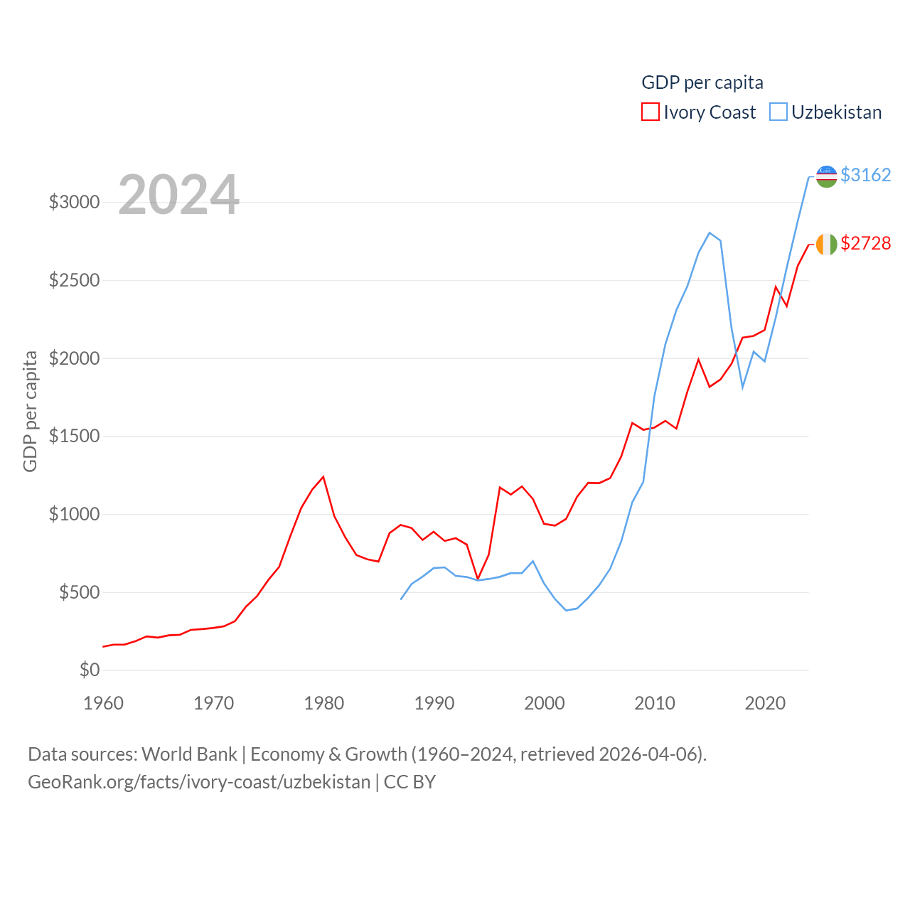 By GDP, Ivory Coast ranks 77/197 ($87.1B) and Uzbekistan ranks 66/197 ($115B). By GDP per capita, Ivory Coast ranks 142/197 ($2,728), while Uzbekistan ranks 139/197 ($3,162).