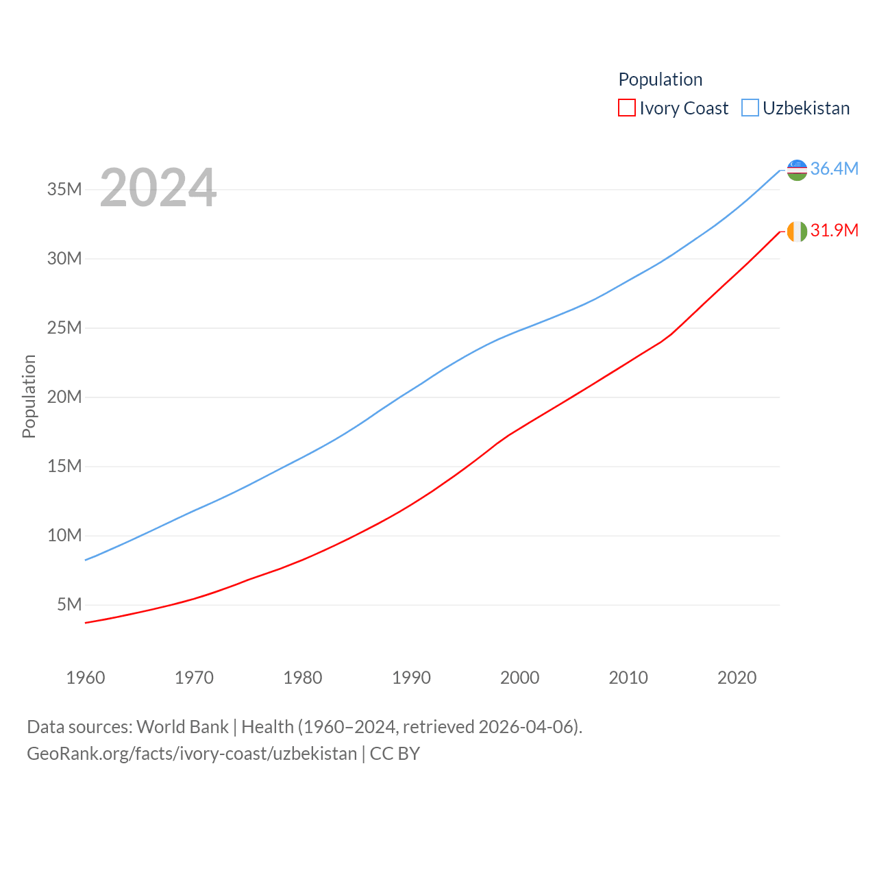 Ivory Coast has a population of 31.9M (ranked 50/197), compared with 36.4M in Uzbekistan (ranked 43/197). Ivory Coast's land area is 122,780 sq mi versus 170,136 sq mi for Uzbekistan (ranked 66th vs. 56th).