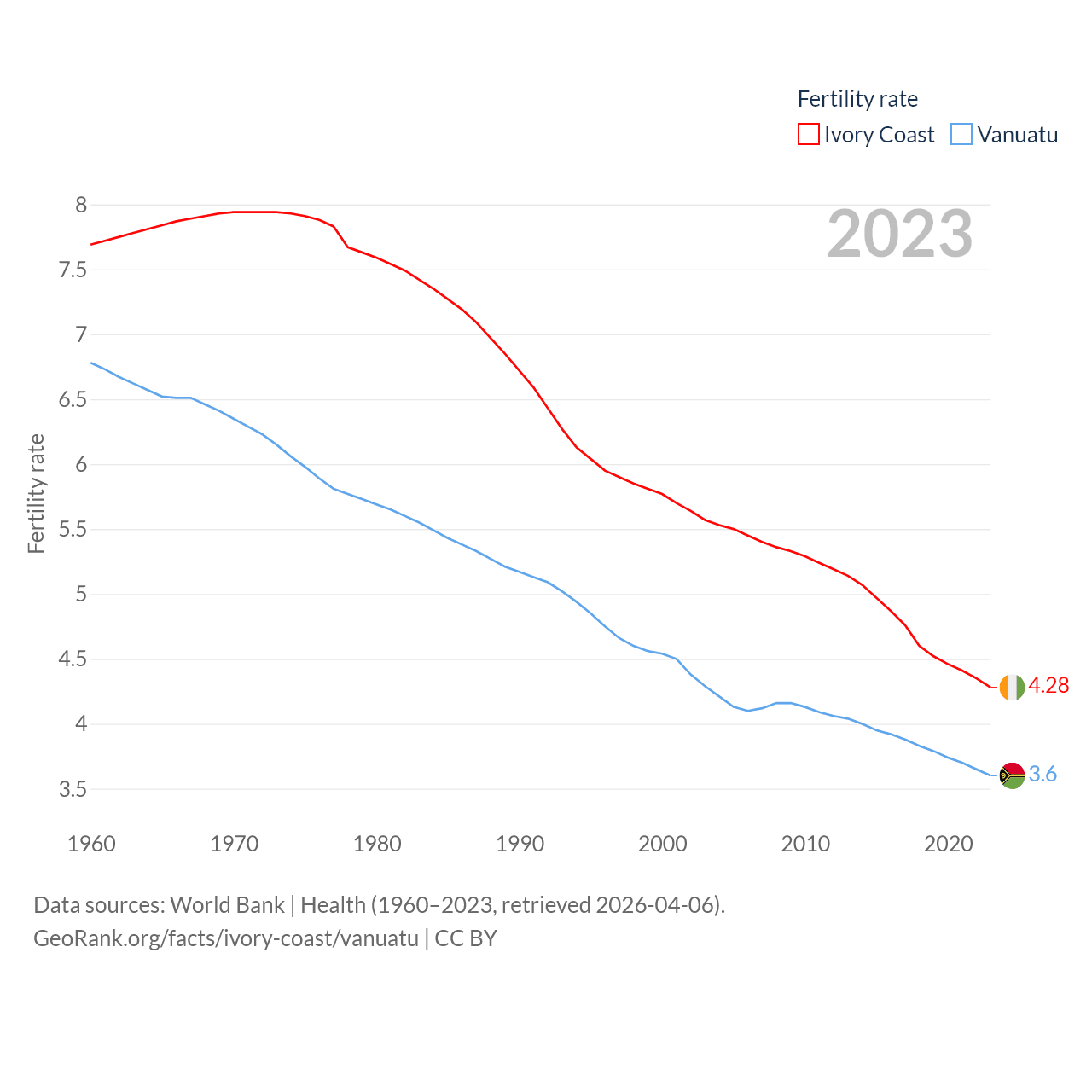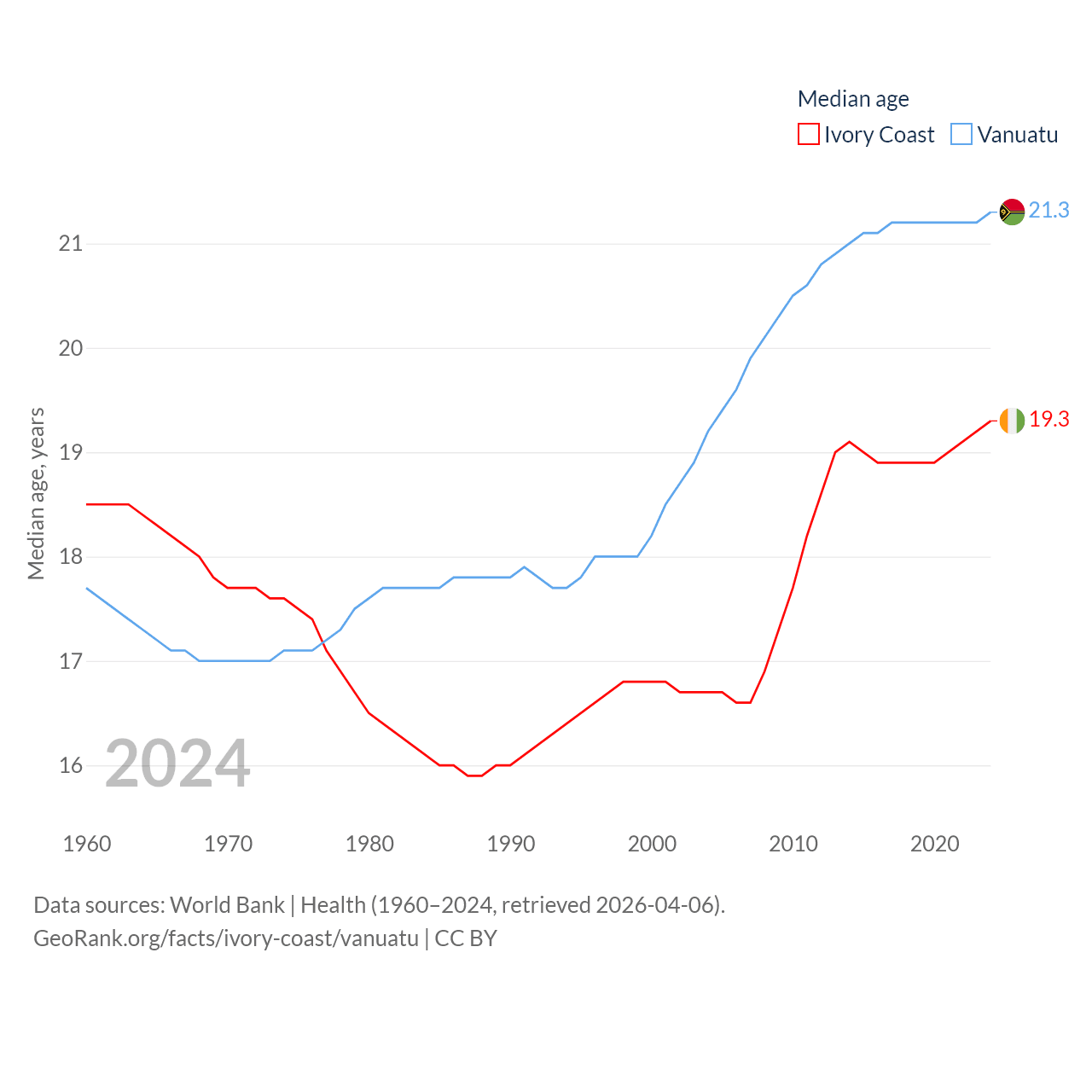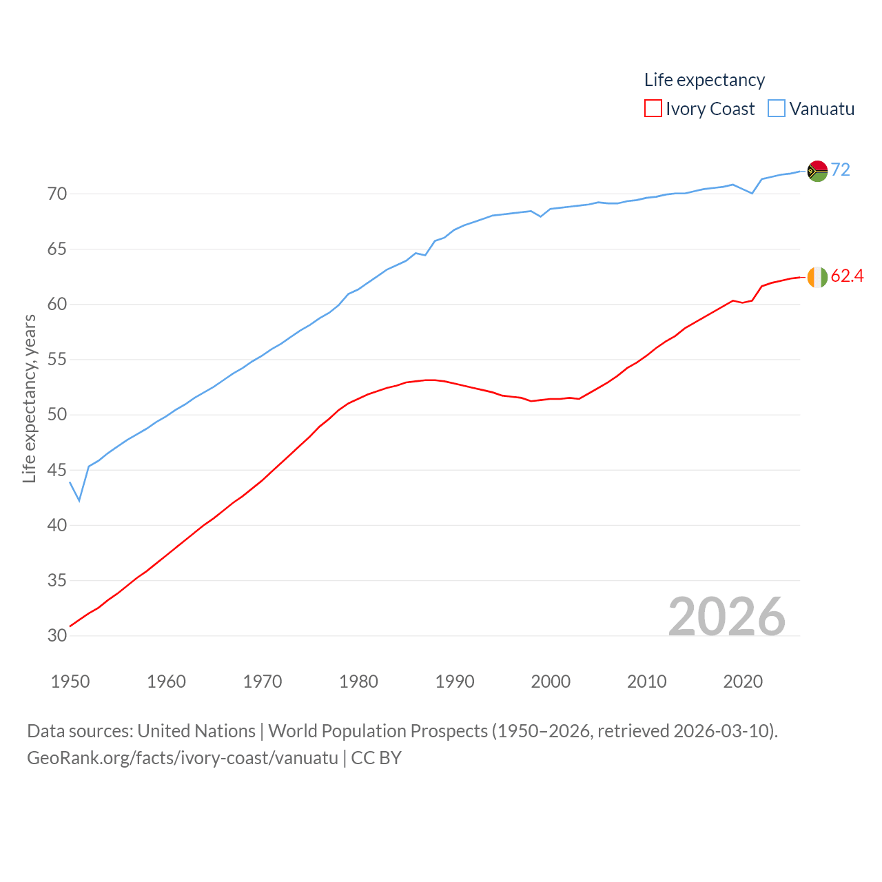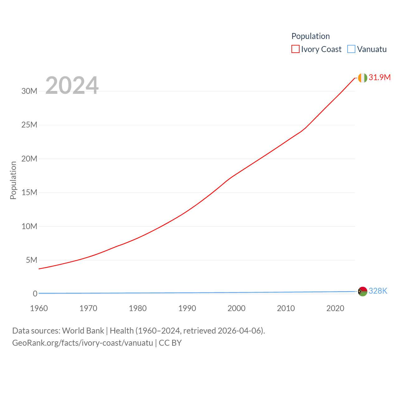 Ivory Coast has a population of 31.9M (ranked 50/197), compared with 328K in Vanuatu (ranked 174/197). Ivory Coast's land area is 122,780 sq mi versus 4,707 sq mi for Vanuatu (ranked 66th vs. 157th).