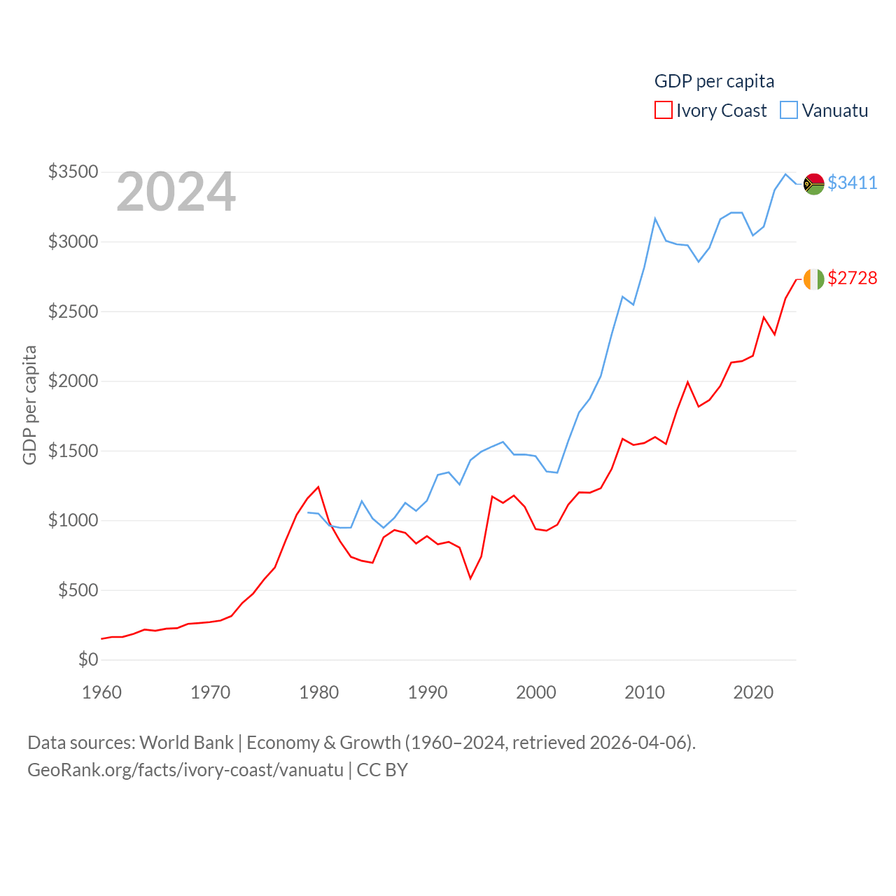 By GDP, Ivory Coast ranks 77/197 ($87.1B) and Vanuatu ranks 188/197 ($1.12B). By GDP per capita, Ivory Coast ranks 142/197 ($2,728), while Vanuatu ranks 137/197 ($3,411).