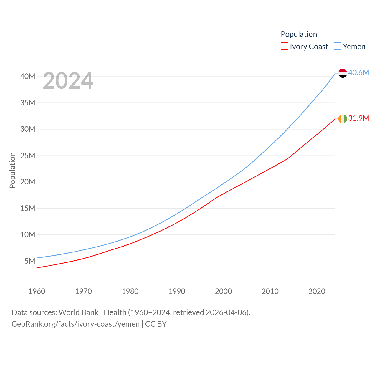 Ivory Coast has a population of 31.9M (ranked 50/197), compared with 40.6M in Yemen (ranked 38/197). Ivory Coast's land area is 122,780 sq mi versus 203,850 sq mi for Yemen (ranked 66th vs. 49th).