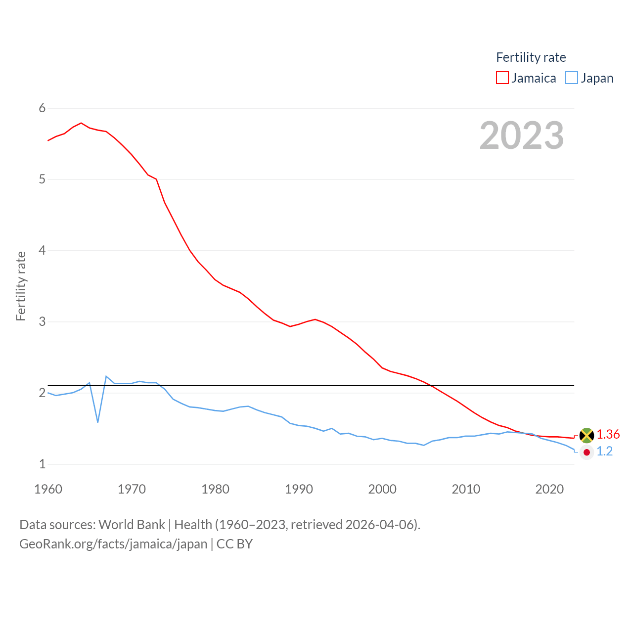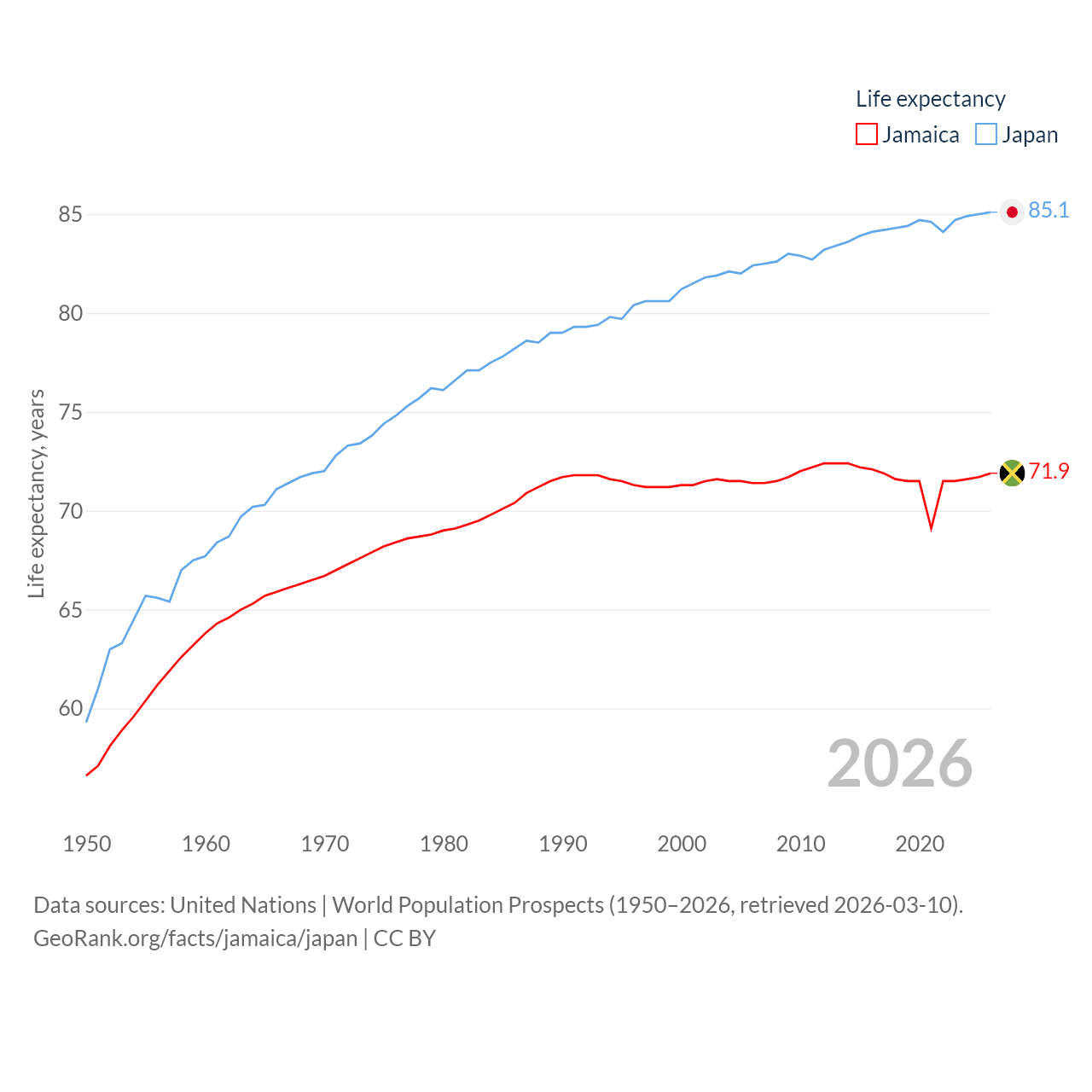 Jamaica has a population of 2.84M (ranked 139/197), compared with 124M in Japan (ranked 12/197). Jamaica's land area is 4,181 sq mi versus 140,761 sq mi for Japan (ranked 159th vs. 61st).