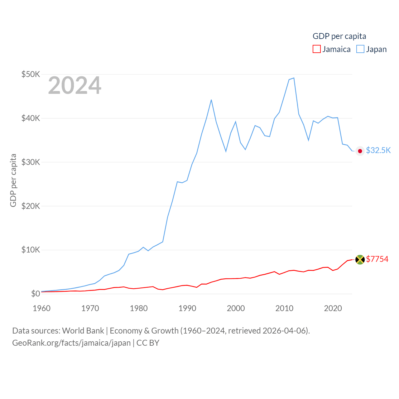 By GDP, Jamaica ranks 124/197 ($22B) and Japan ranks 4/197 ($4.03T). By GDP per capita, Jamaica ranks 95/197 ($7,754), while Japan ranks 38/197 ($32,487).