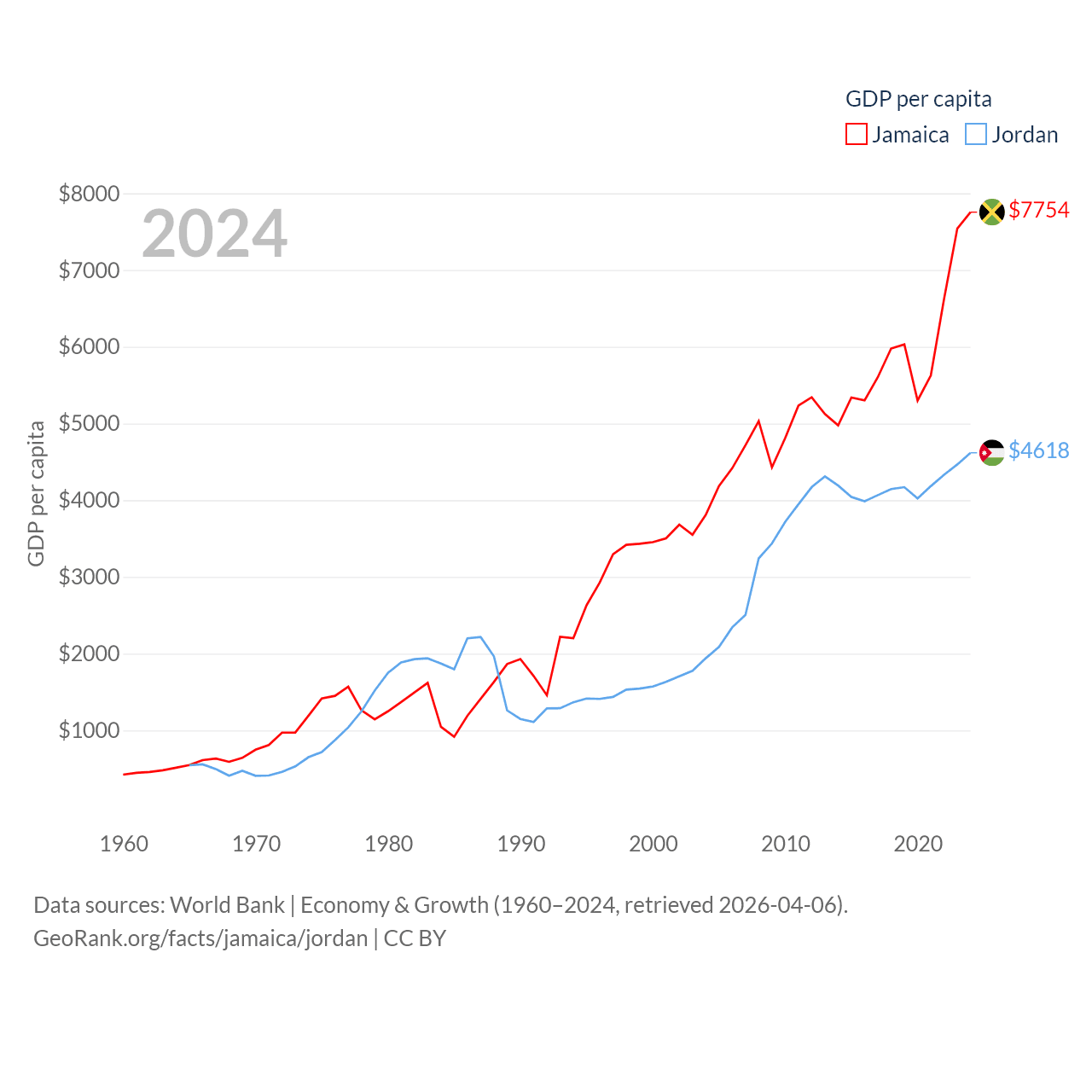 By GDP, Jamaica ranks 124/197 ($22B) and Jordan ranks 90/197 ($53.4B). By GDP per capita, Jamaica ranks 95/197 ($7,754), while Jordan ranks 123/197 ($4,618).