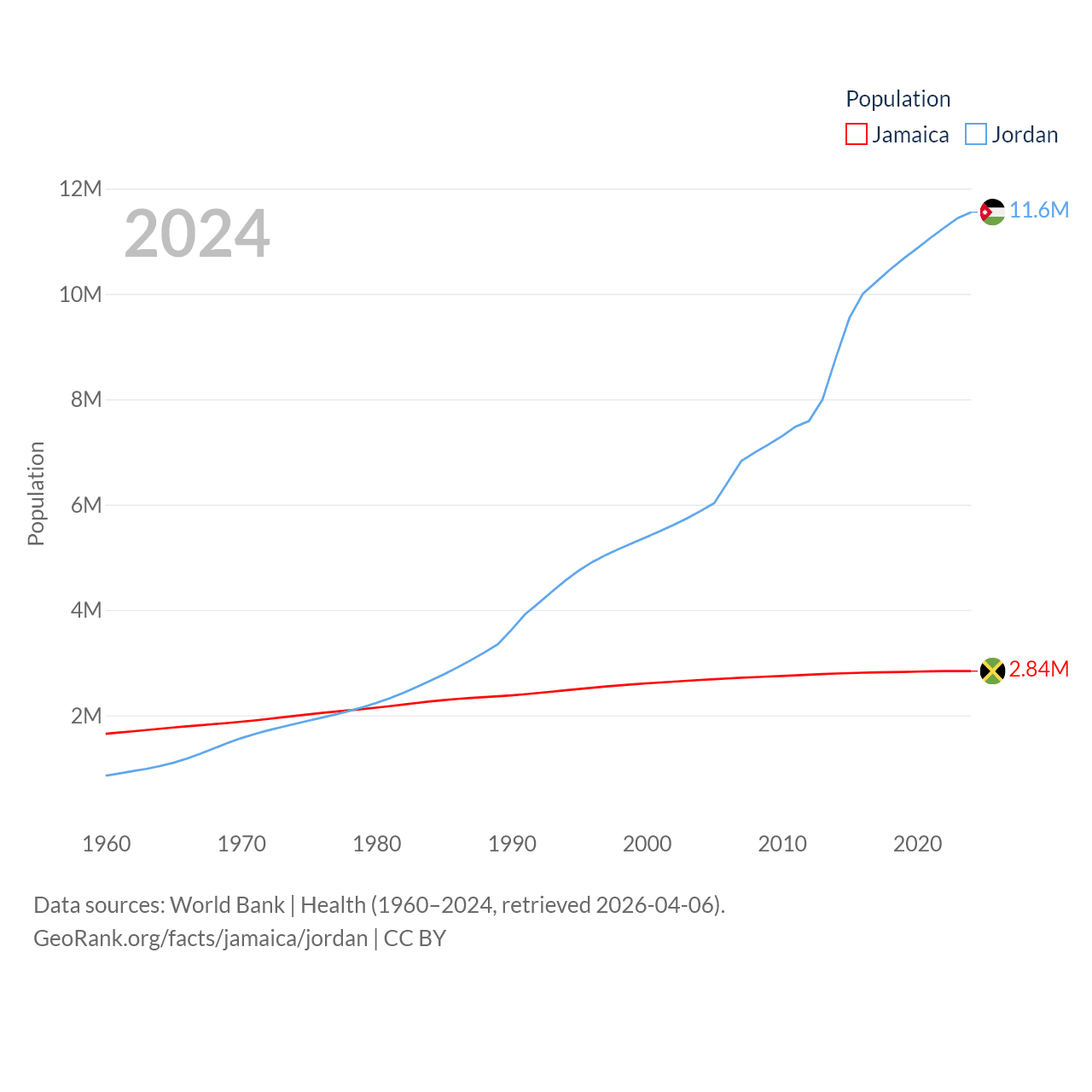 Jamaica has a population of 2.84M (ranked 139/197), compared with 11.6M in Jordan (ranked 84/197). Jamaica's land area is 4,181 sq mi versus 34,284 sq mi for Jordan (ranked 159th vs. 110th).